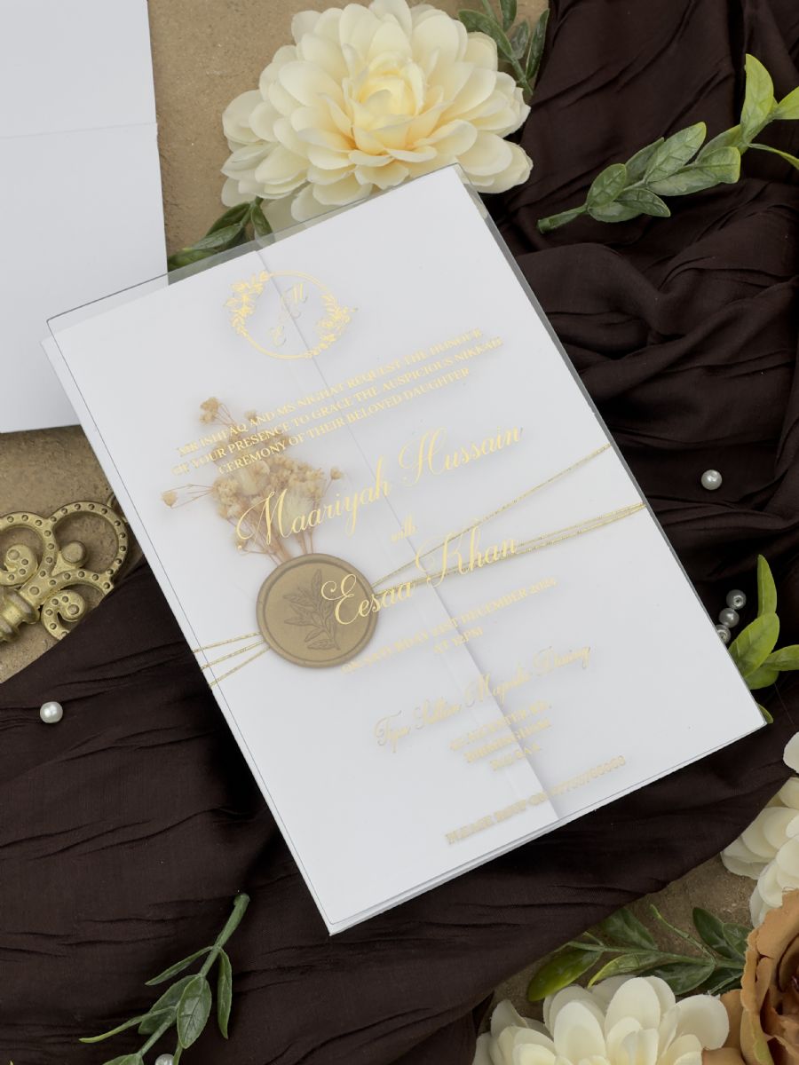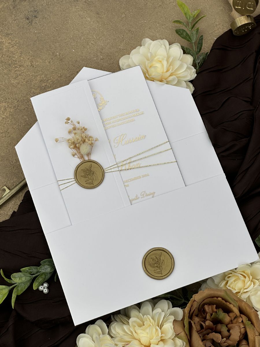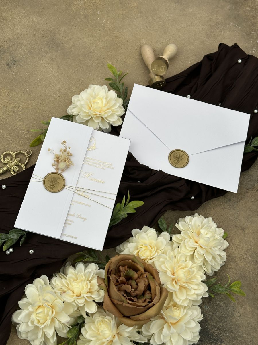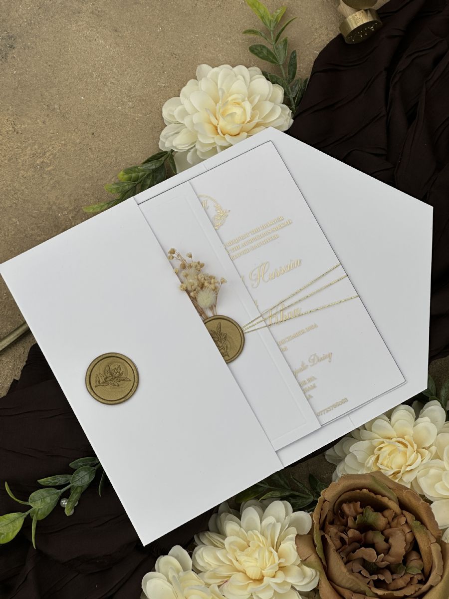 Altın Baskılı Parlak Beyaz Yarım Kapaklı Kaliteli Akrilik Düğün Davetiyesi