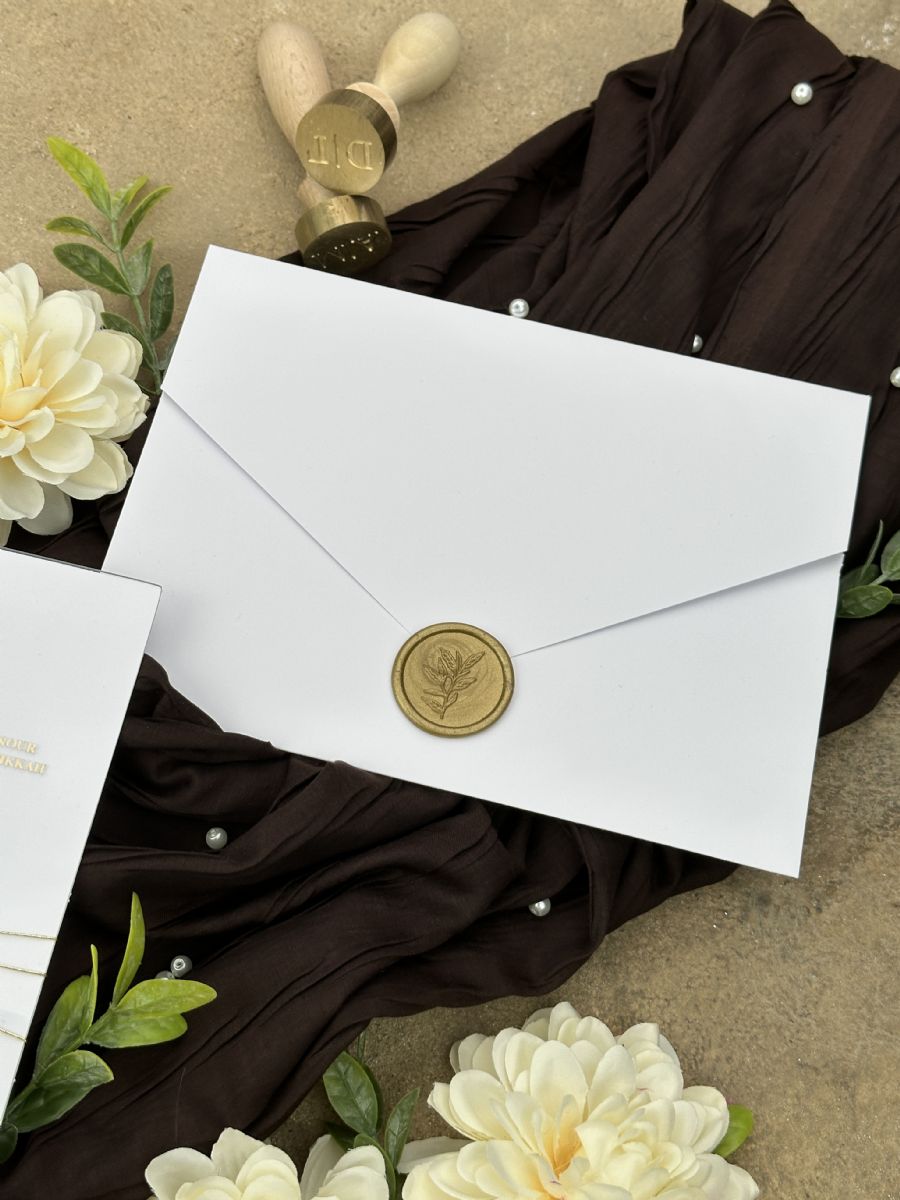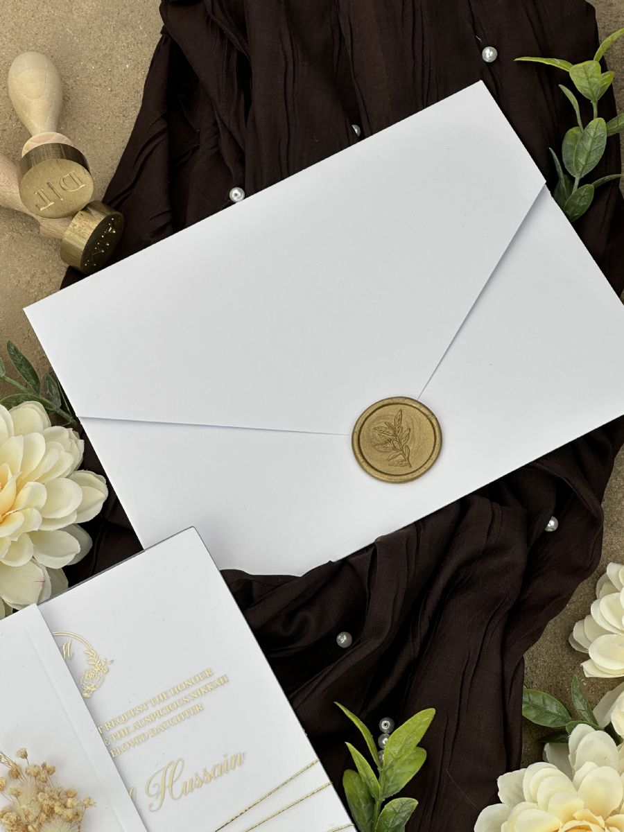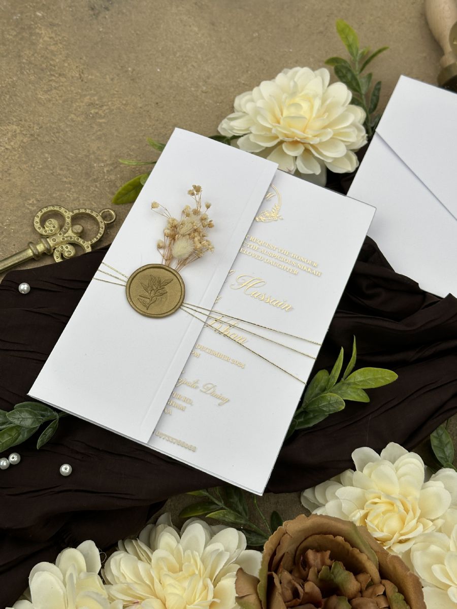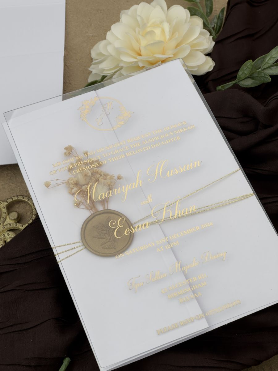 Altın Baskılı Parlak Beyaz Yarım Kapaklı Kaliteli Akrilik Düğün Davetiyesi
