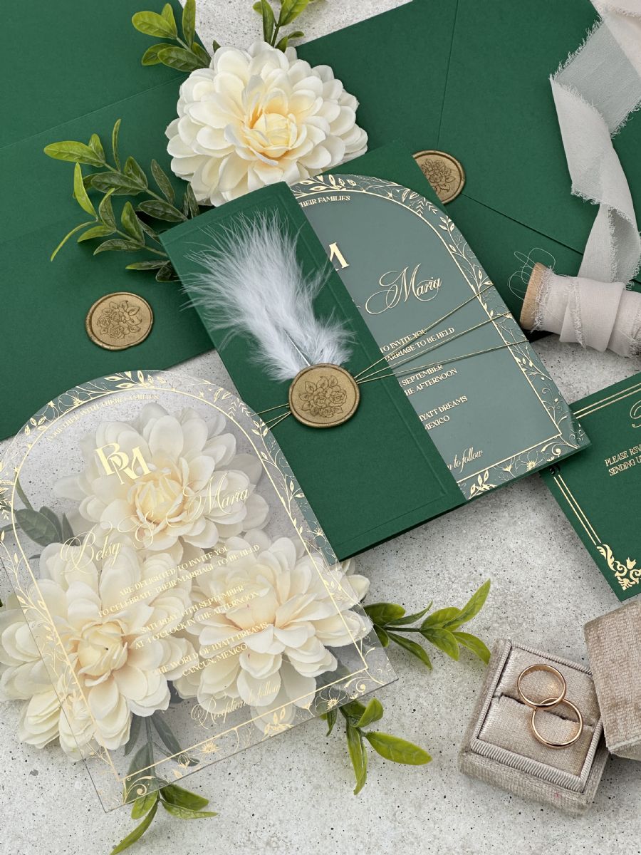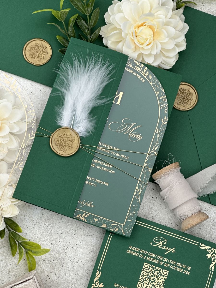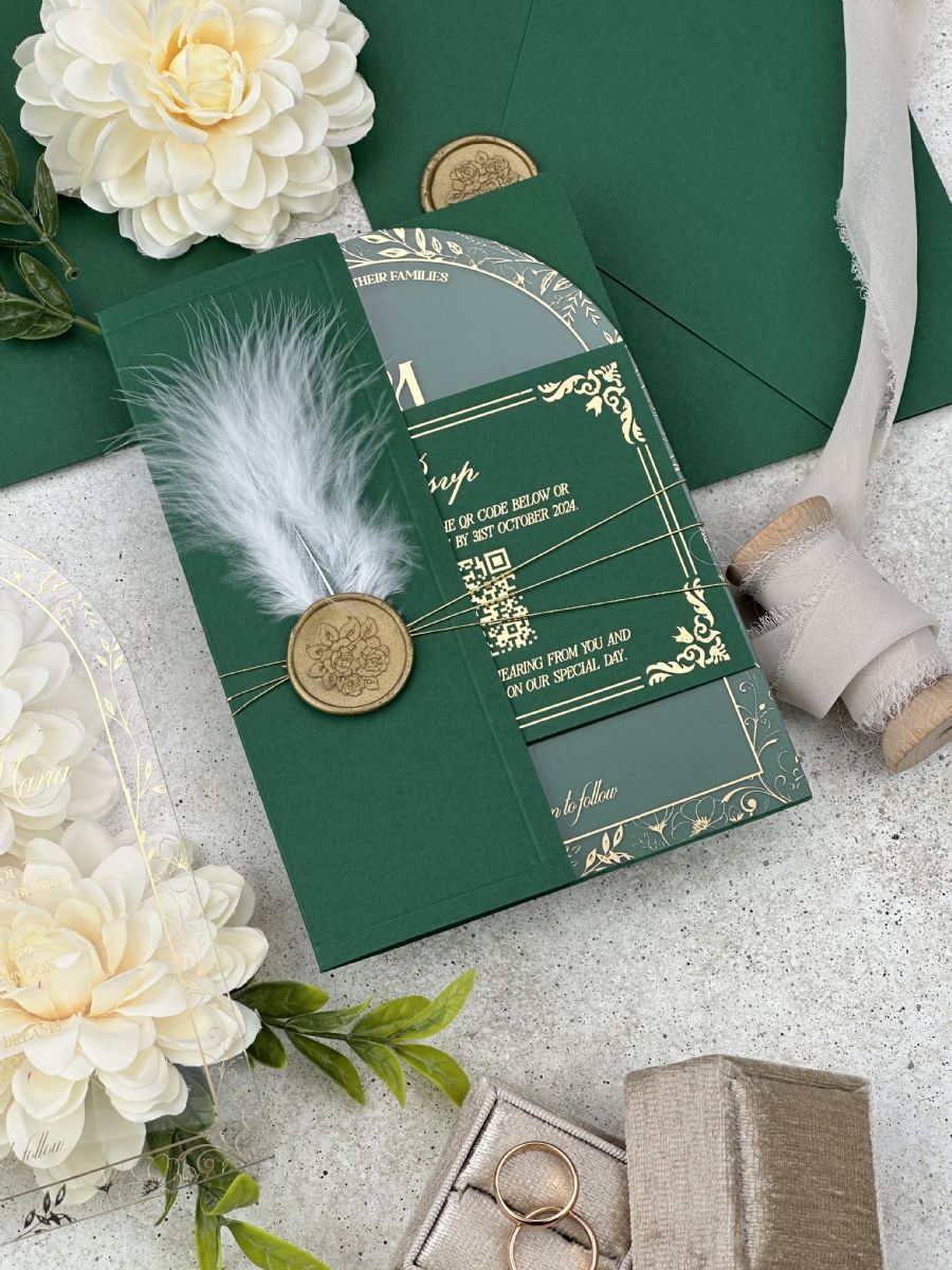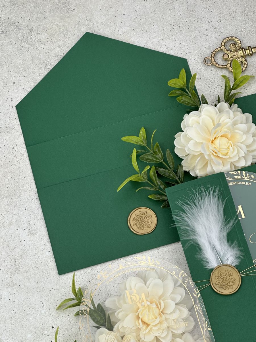 Altın Baskılı Şeffaf Kemer Akrilik ve Tüy Dekorlu Zümrüt Yeşili Yarım Kapak Zarf Düğün Davetiyesi