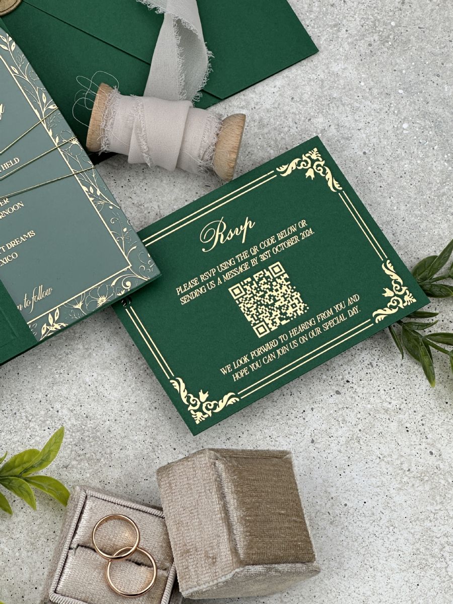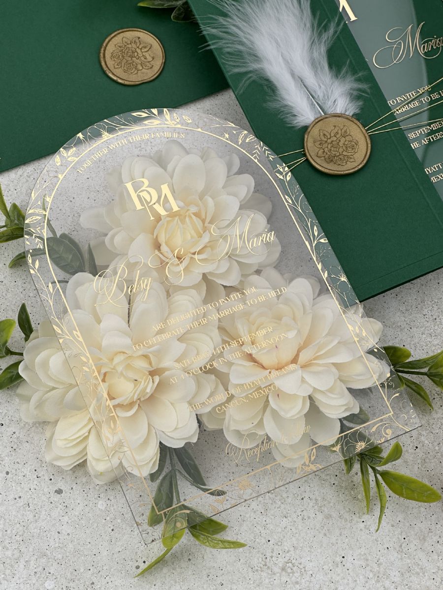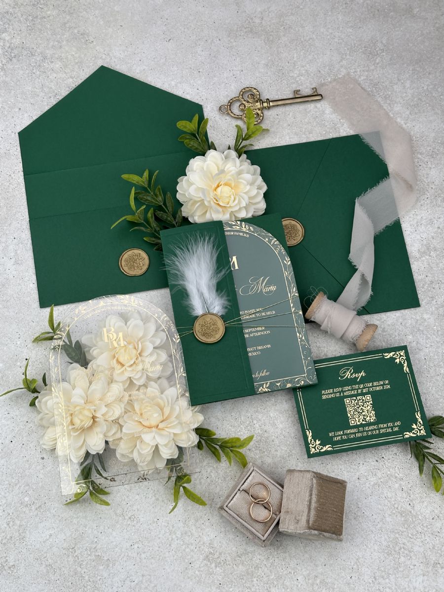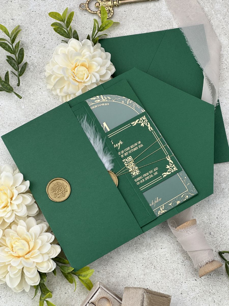 Altın Baskılı Şeffaf Kemer Akrilik ve Tüy Dekorlu Zümrüt Yeşili Yarım Kapak Zarf Düğün Davetiyesi