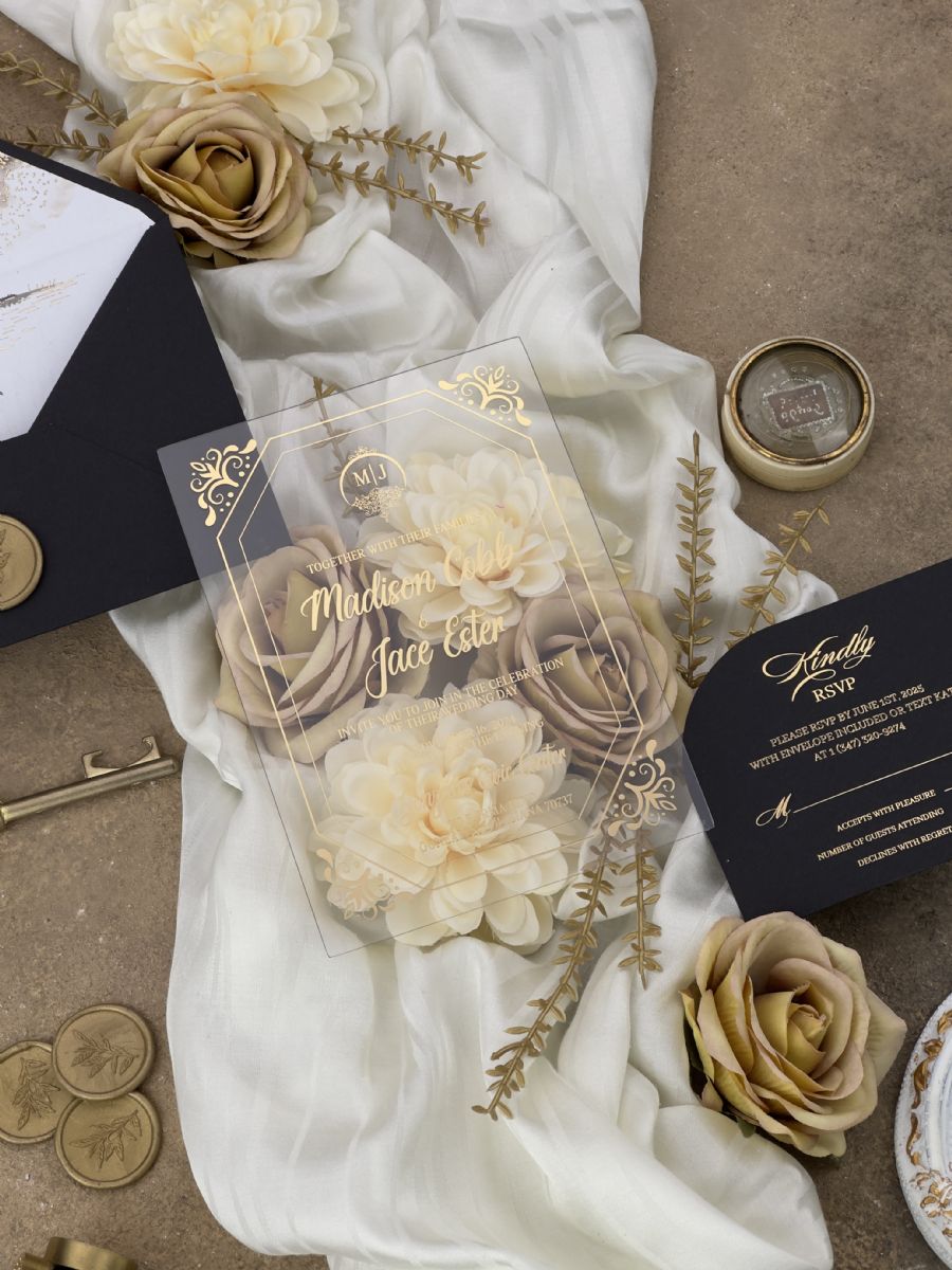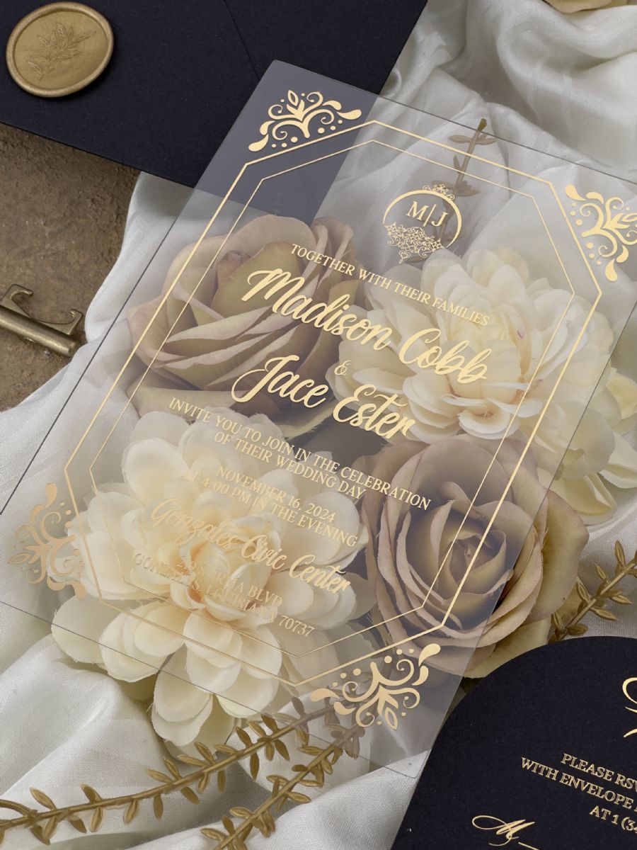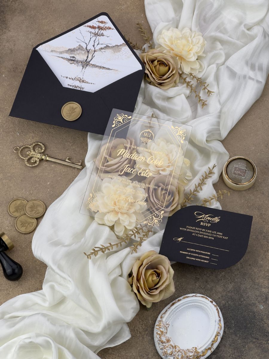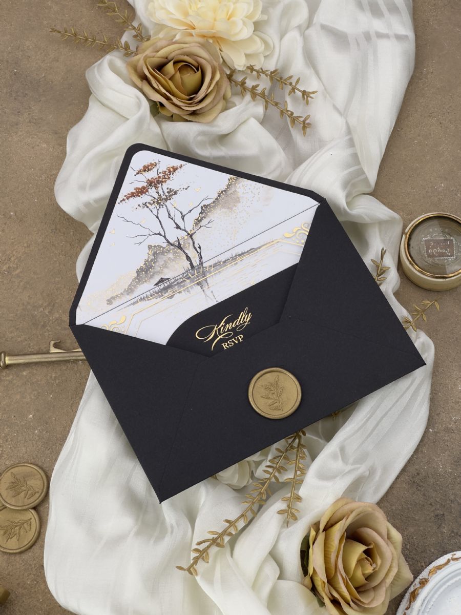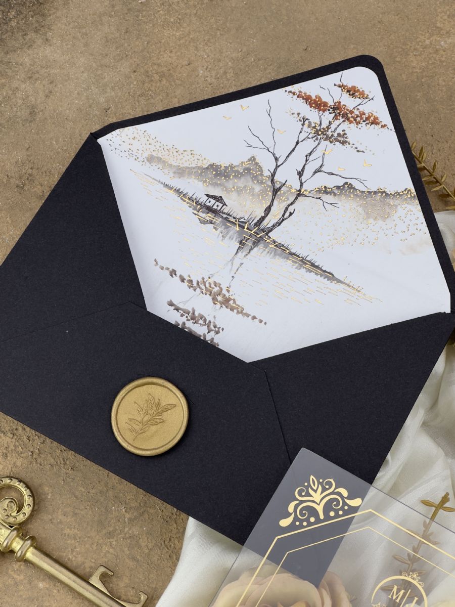 Altın Baskılı Sulu Boyalı Çizim Astarlı Akrilik Davetiye