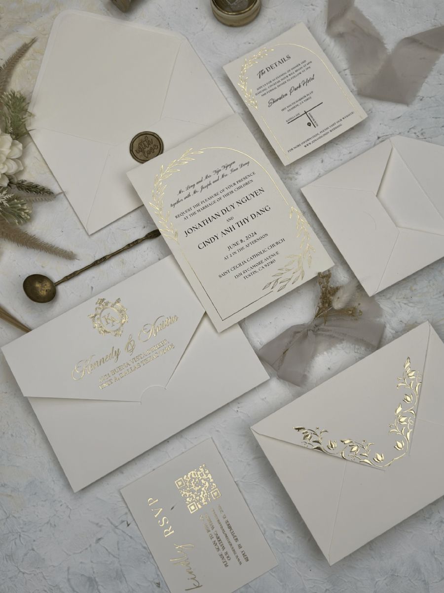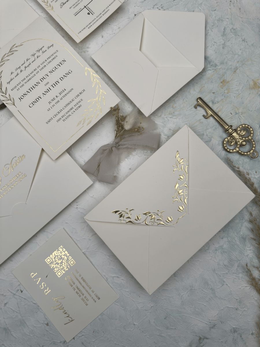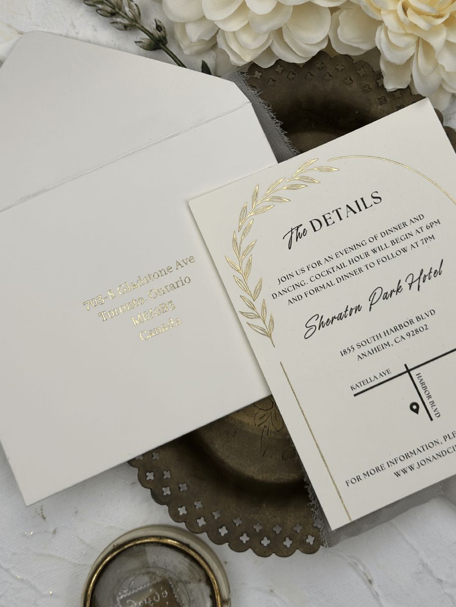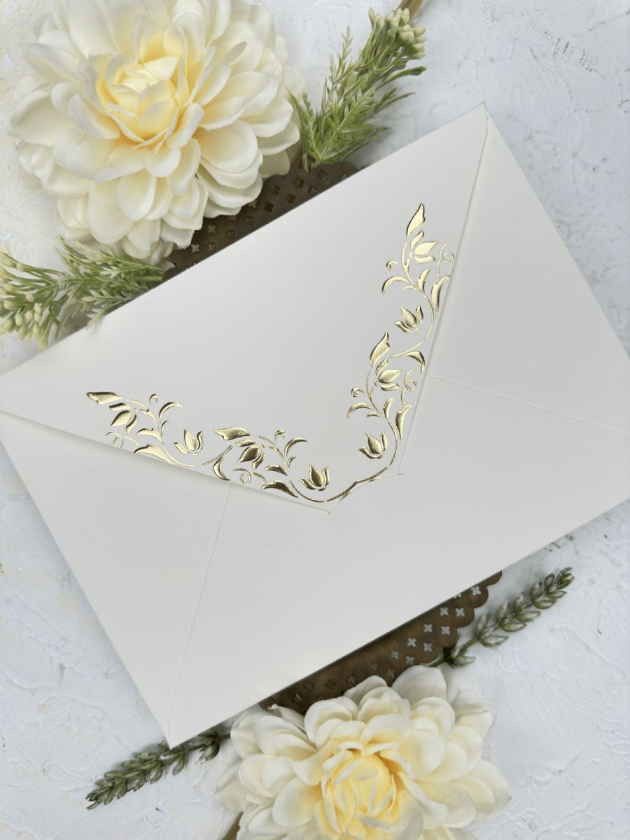 Altın Ve Siyah Baskılı Davetiye İle Zarif Kabartma Baskılı Zarflı Düğün Davetiyesi