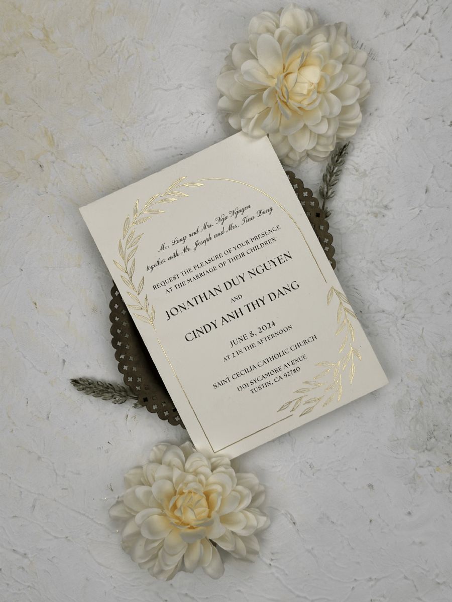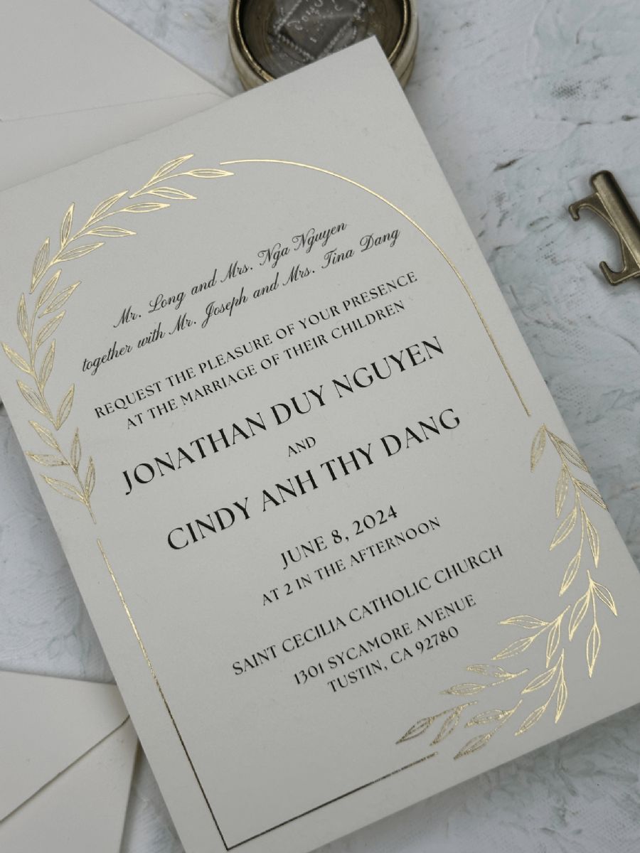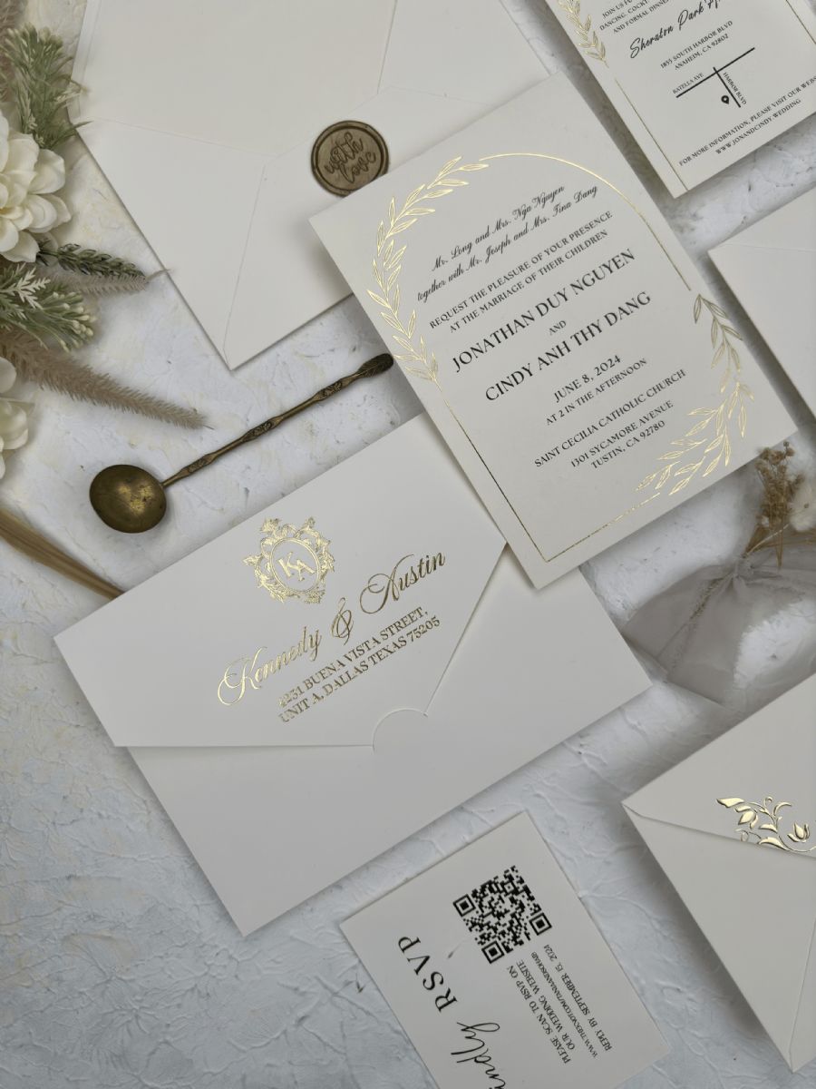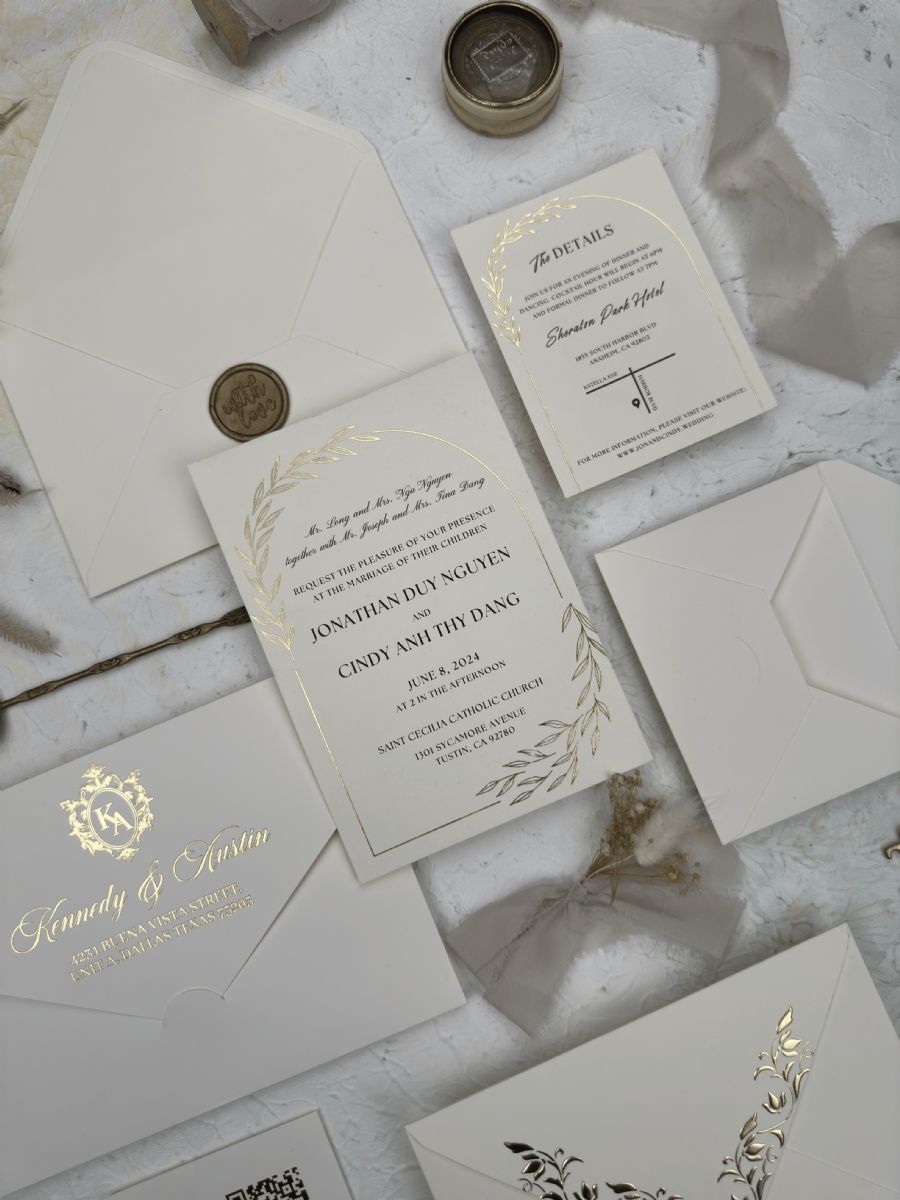 Altın Ve Siyah Baskılı Davetiye İle Zarif Kabartma Baskılı Zarflı Düğün Davetiyesi