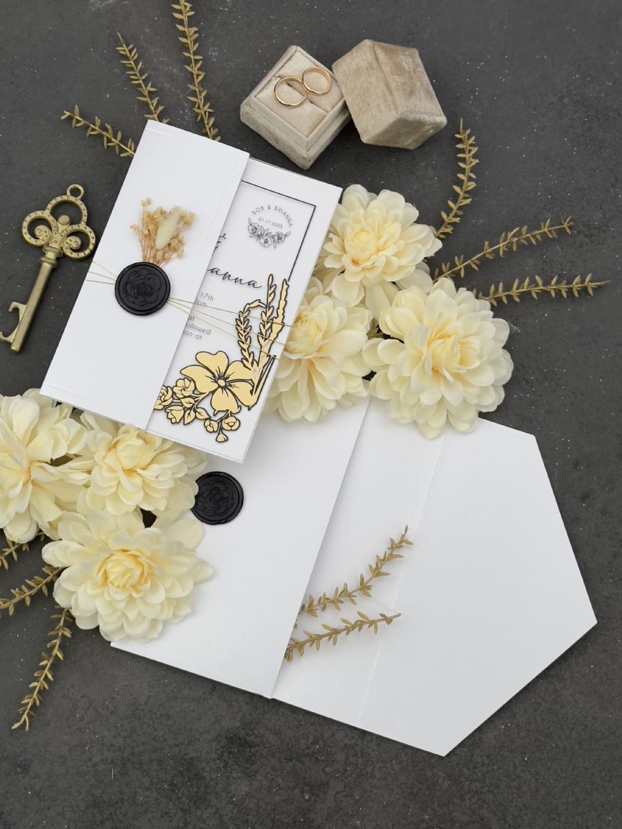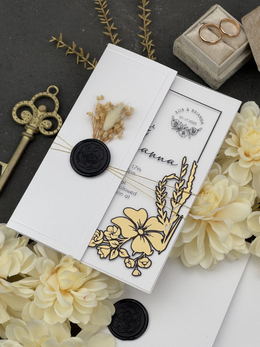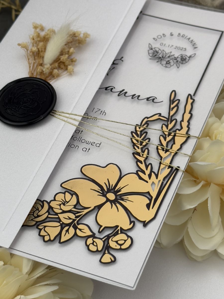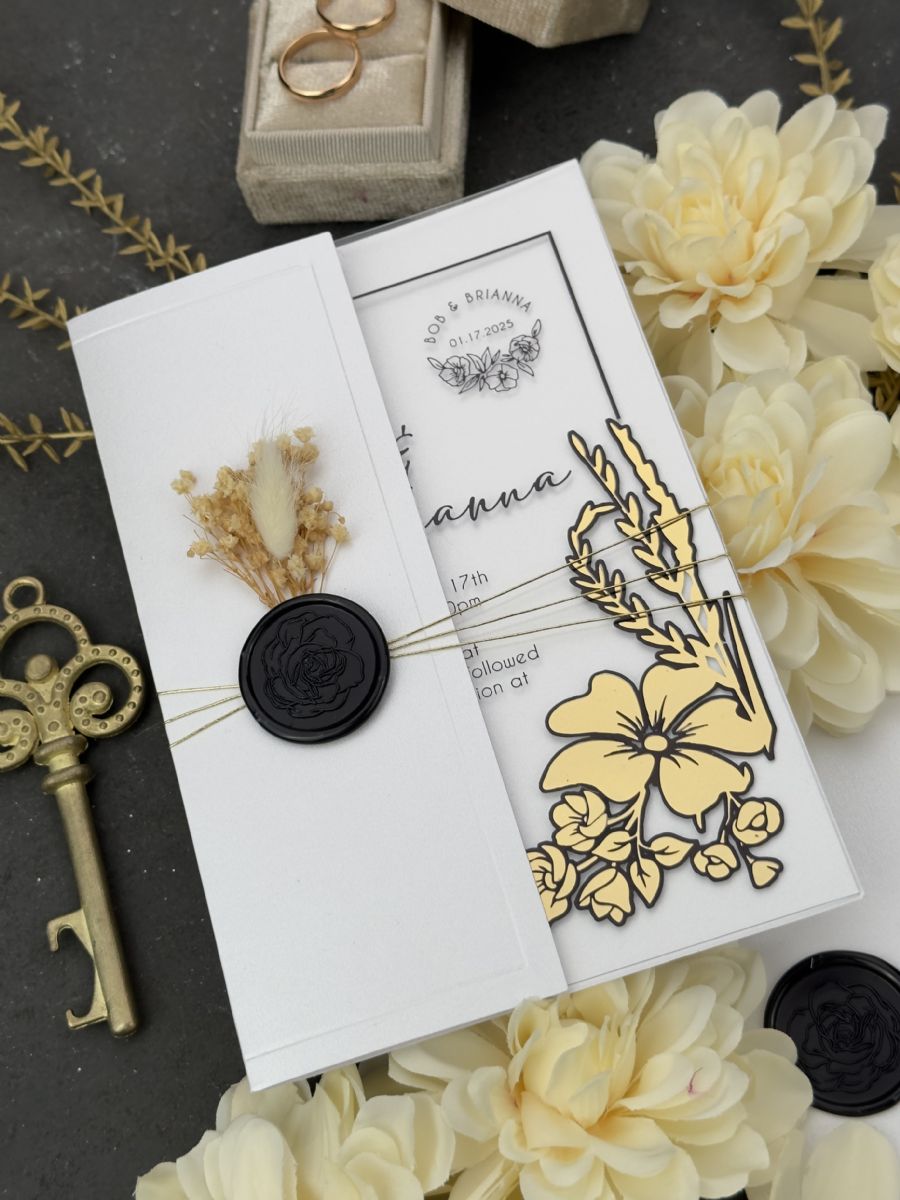 Altın Ve Siyah Çiçek Motif Baskılı Kuru Çiçek Süslemeli Zarif Düğün Davetiyesi