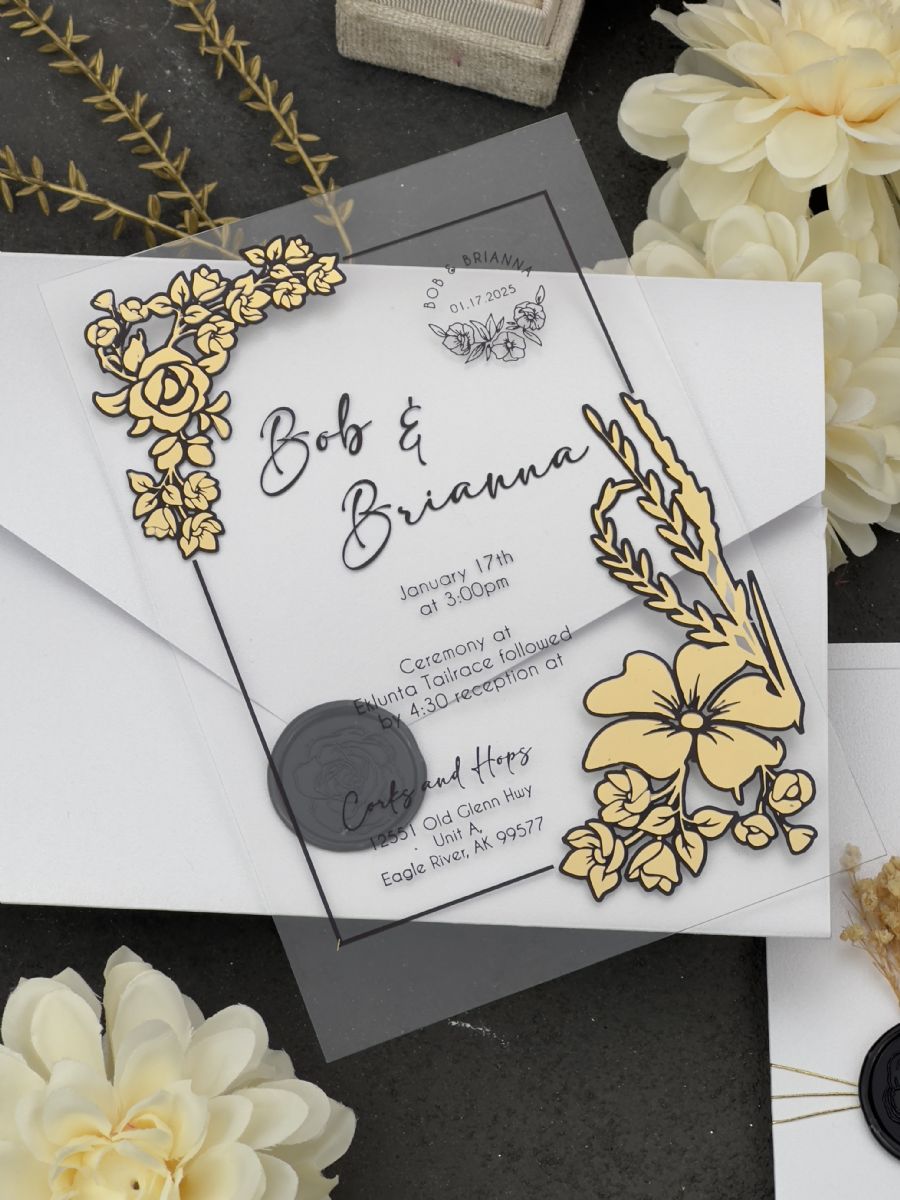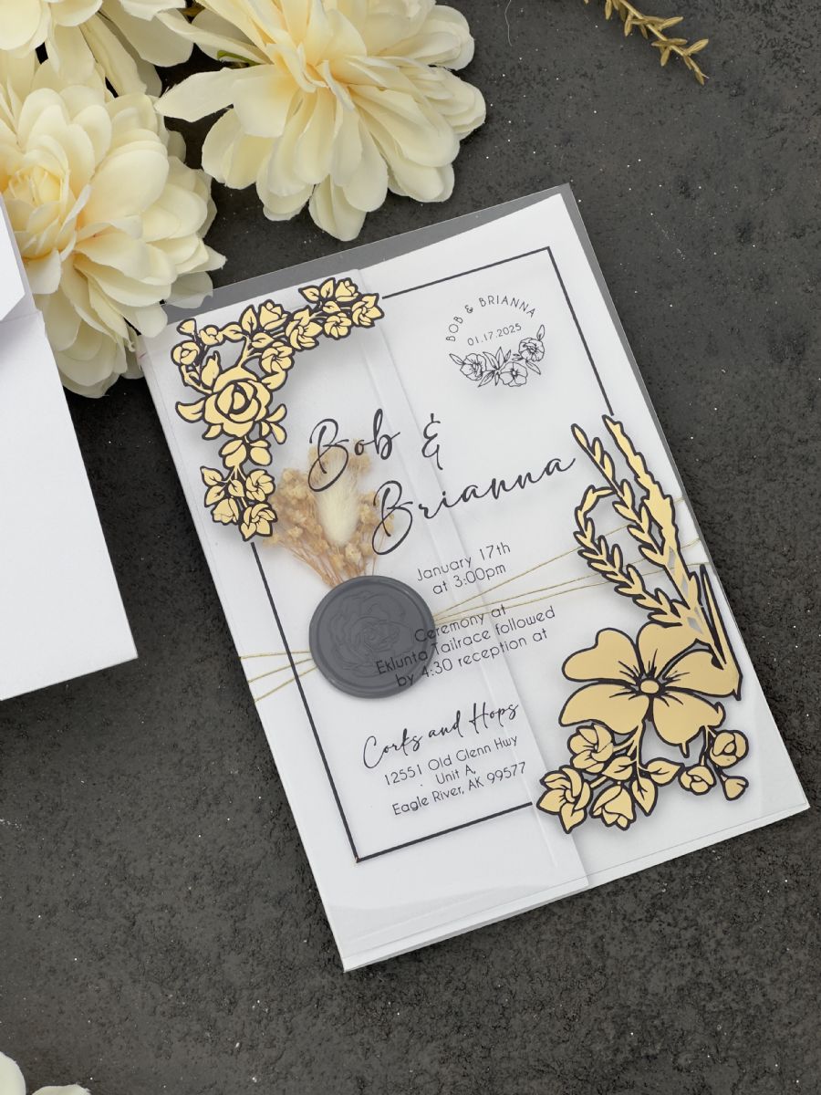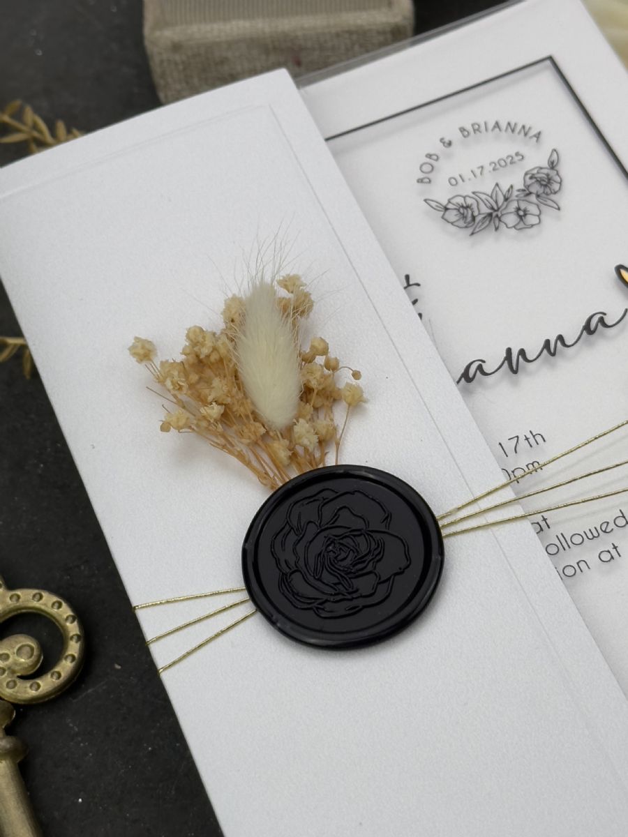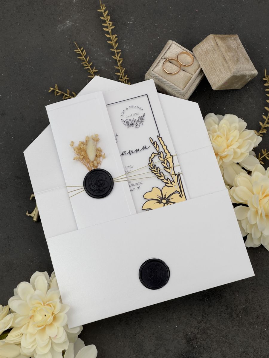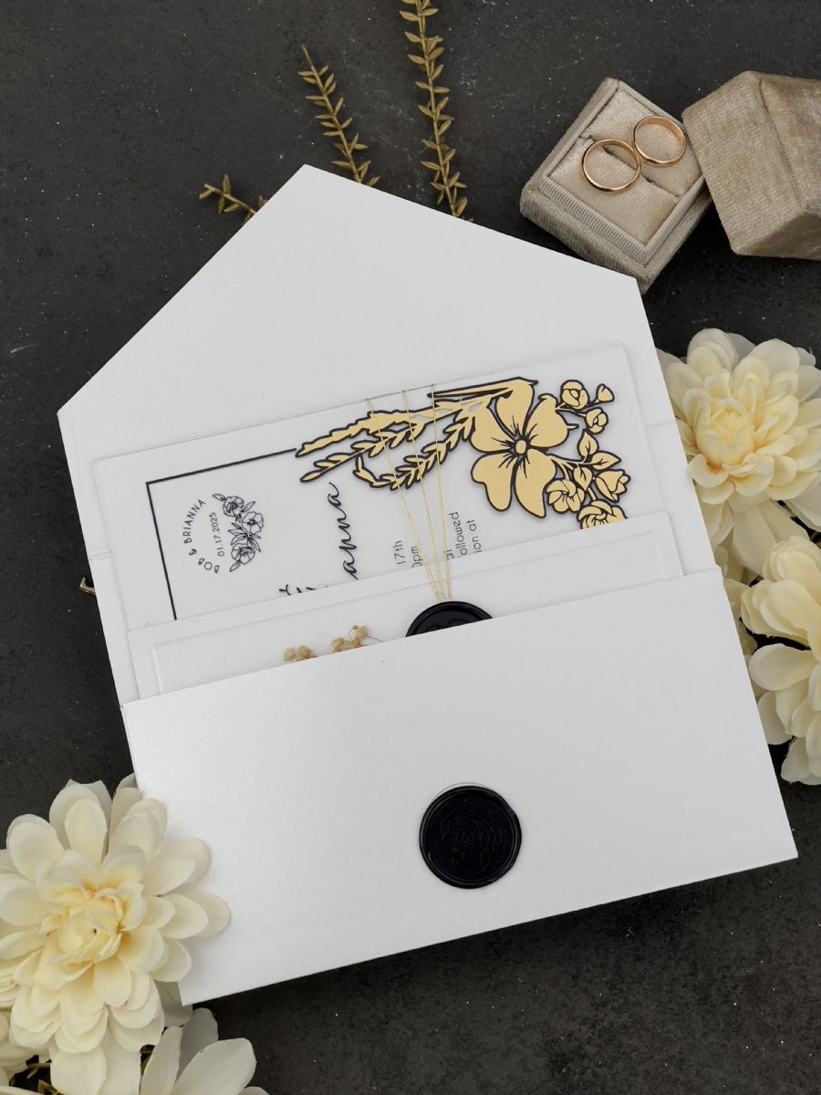 Altın Ve Siyah Çiçek Motif Baskılı Kuru Çiçek Süslemeli Zarif Düğün Davetiyesi