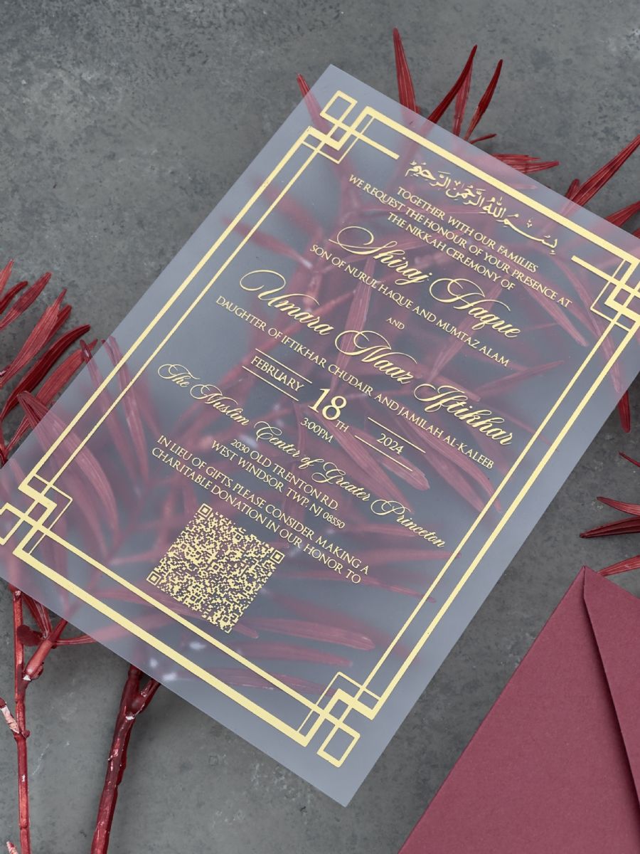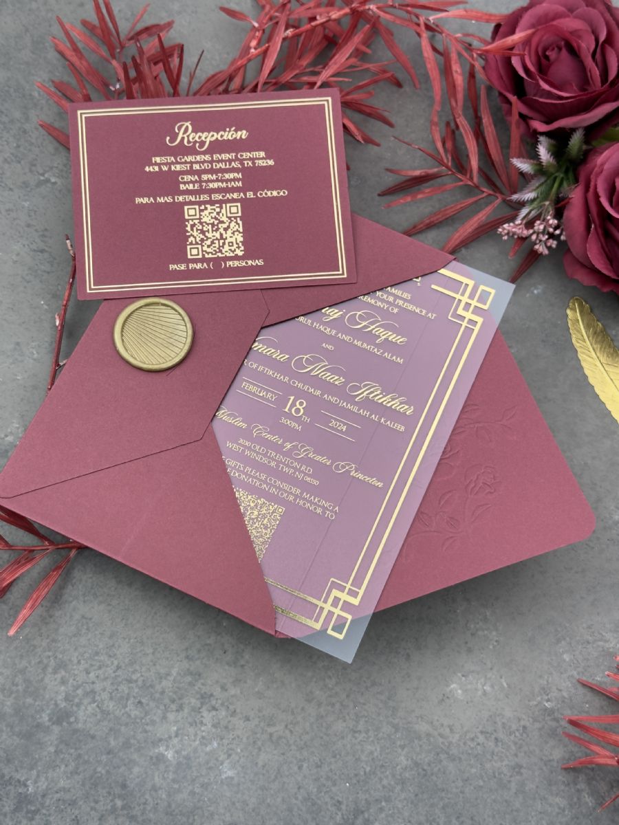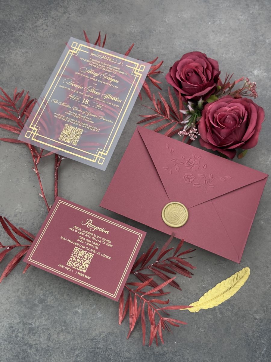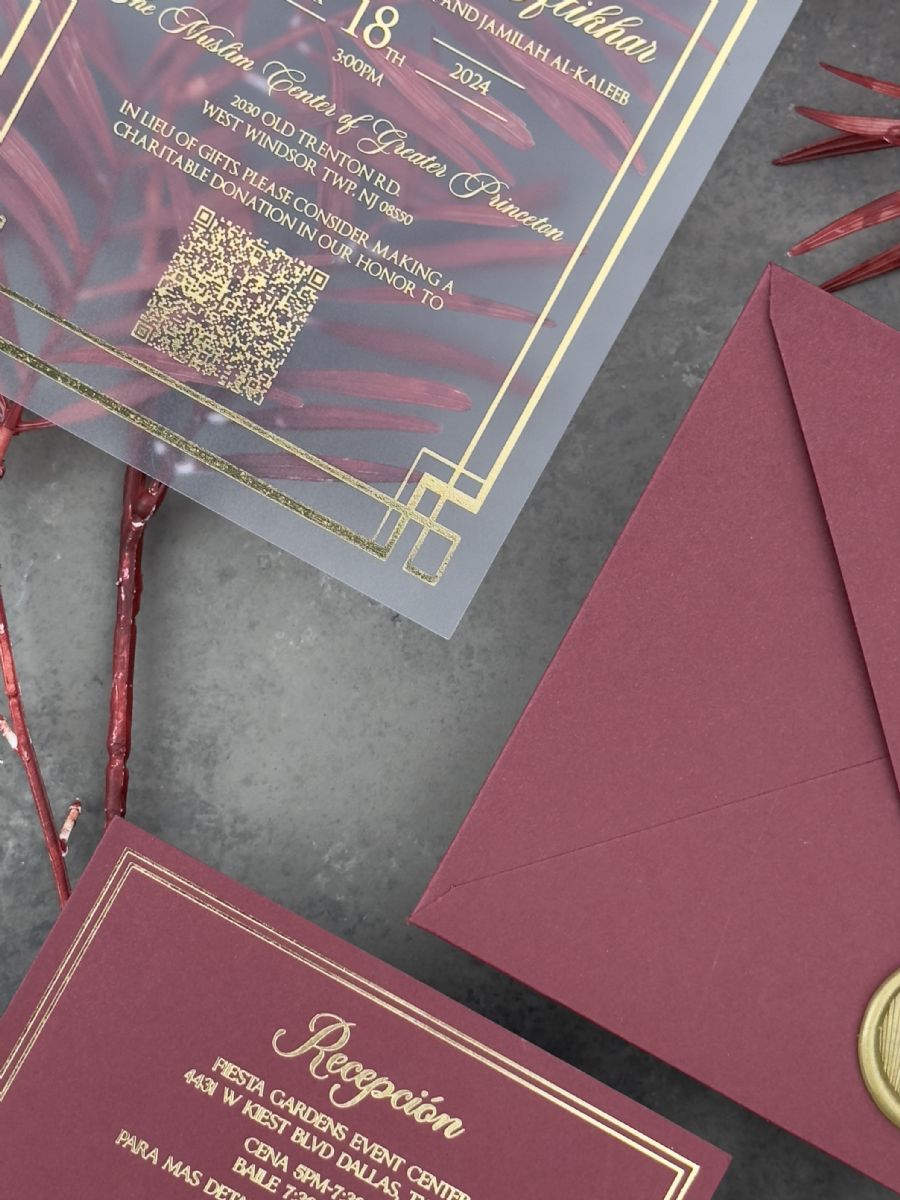 Bordo Zarflı Altın Çerçeve Desenli Akrilik Düğün Davetiyesi
