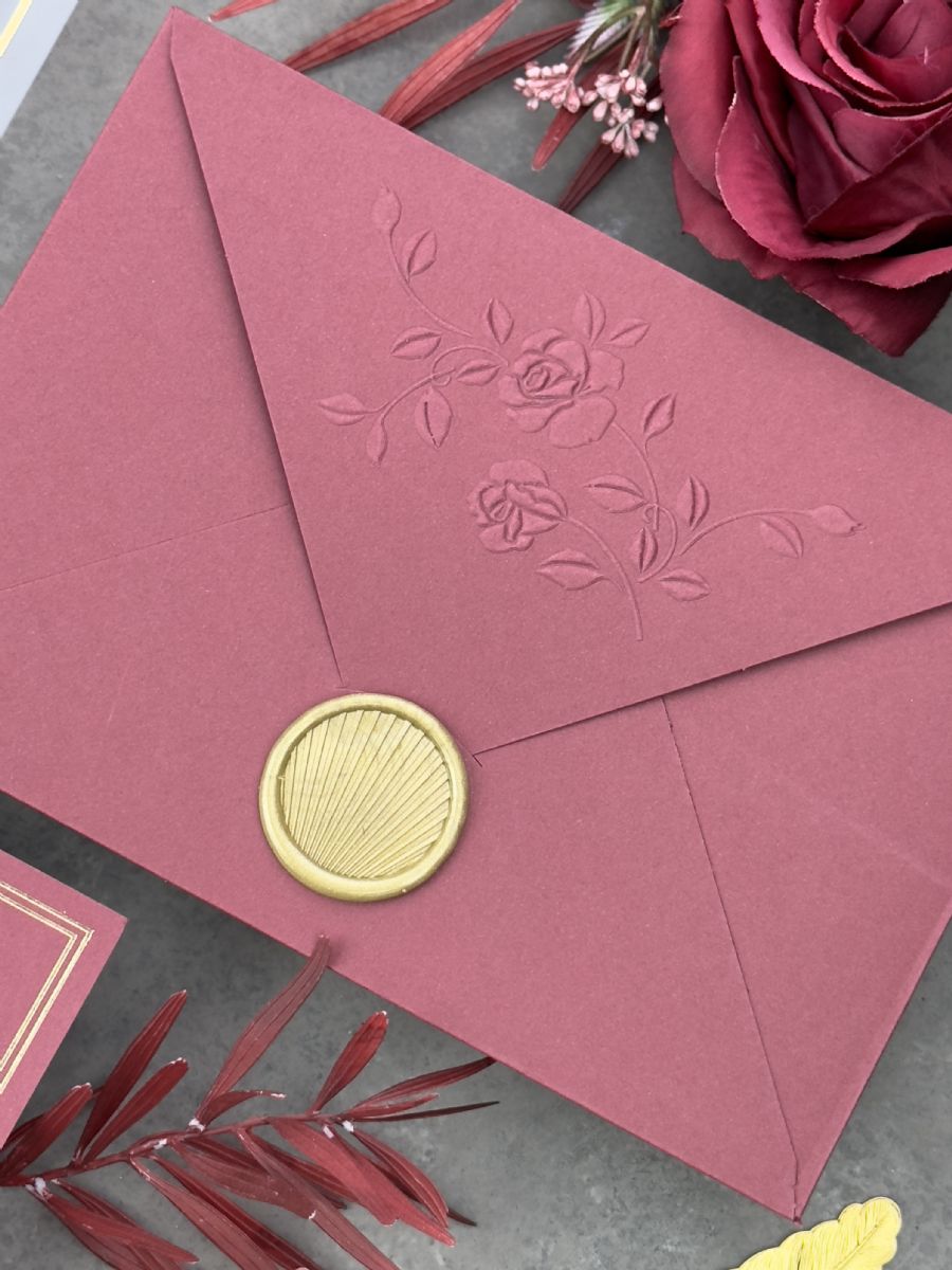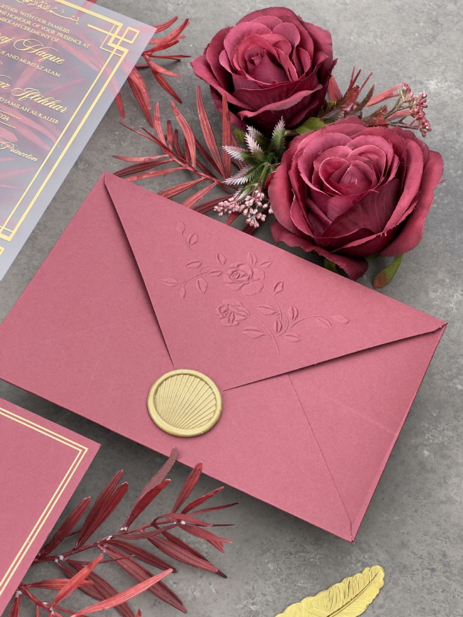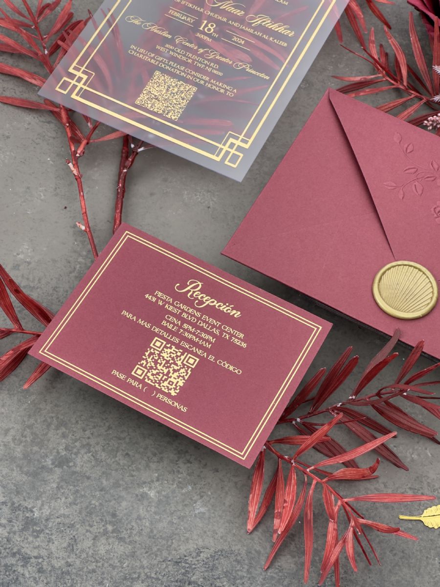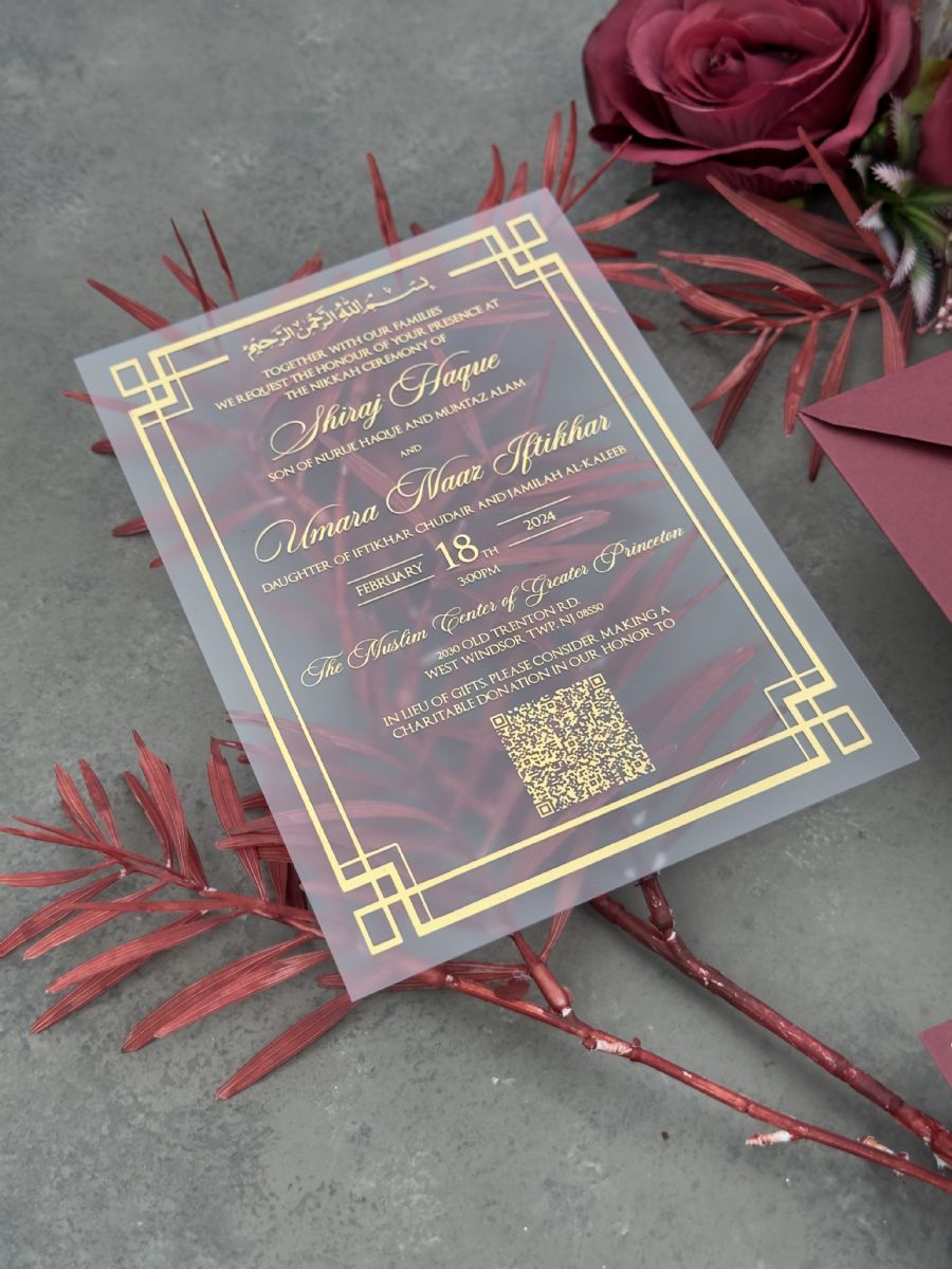 Bordo Zarflı Altın Çerçeve Desenli Akrilik Düğün Davetiyesi