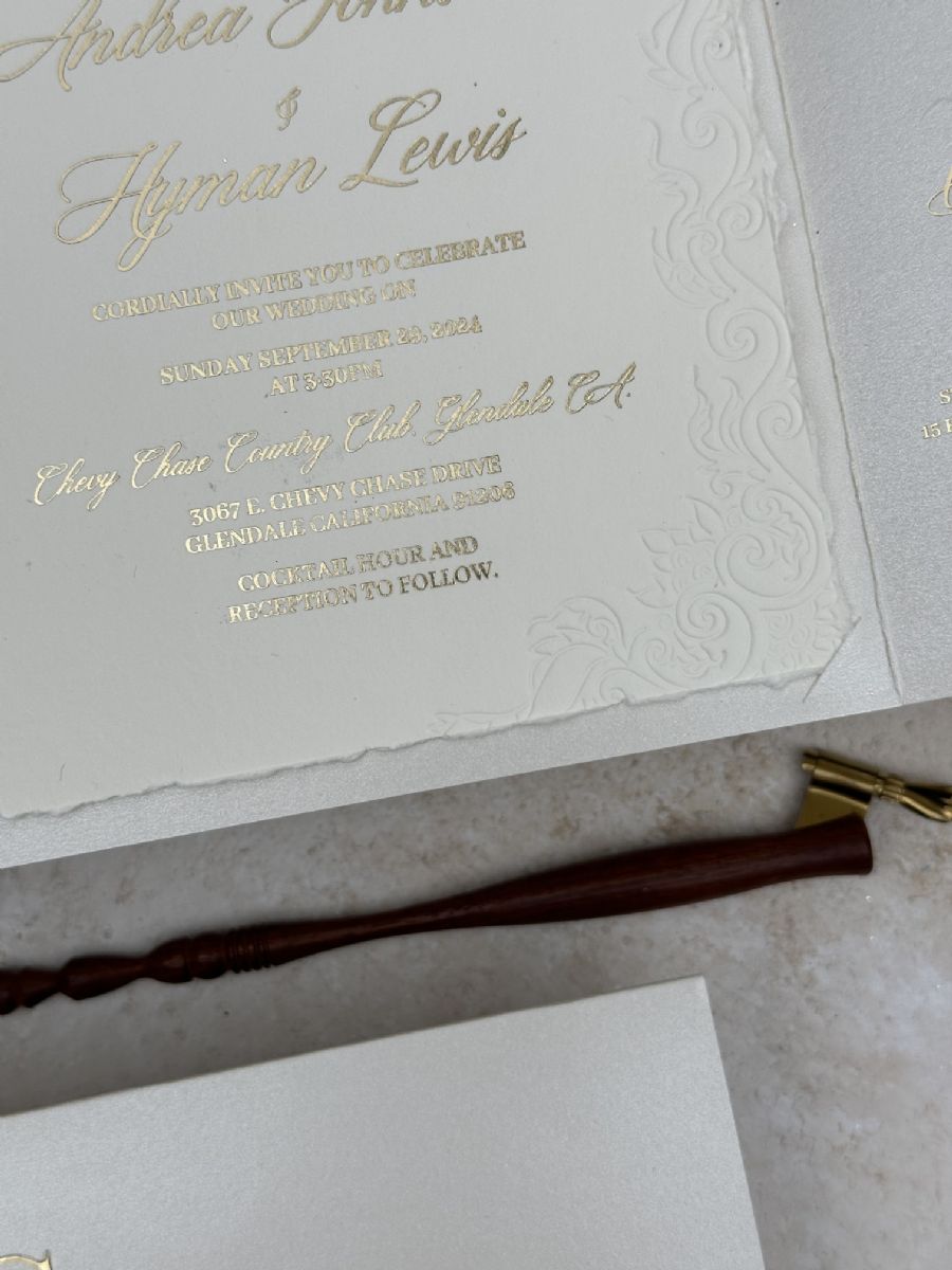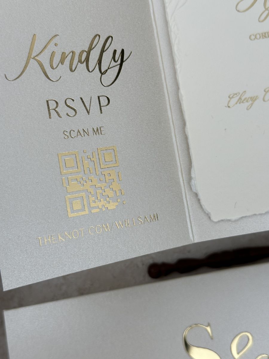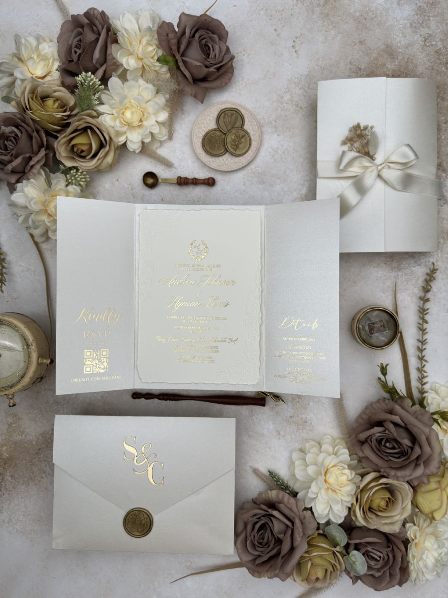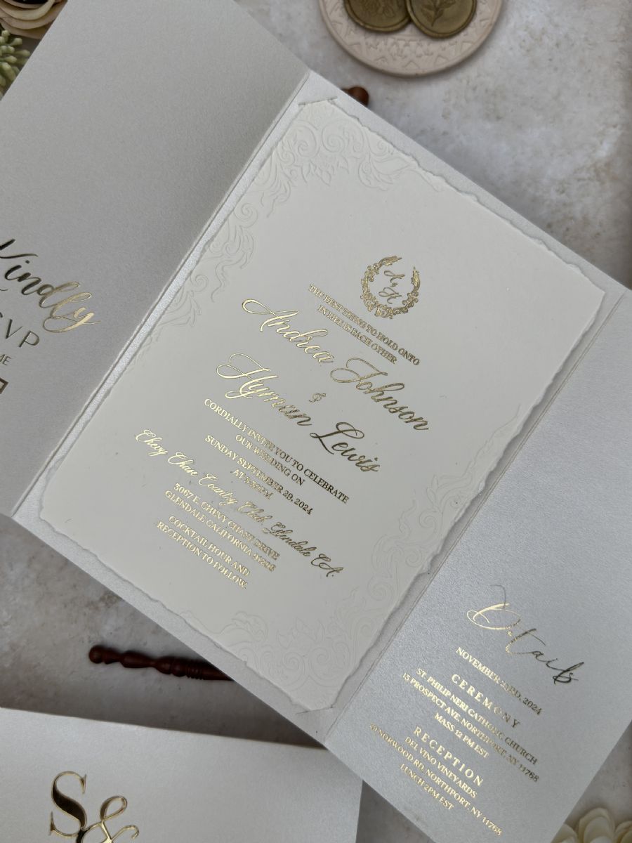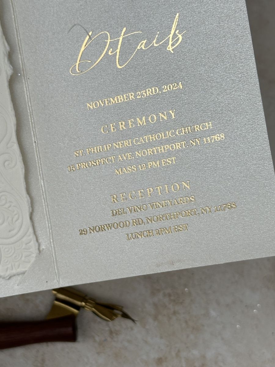 Çift Kapaklı Rsvp Ve Detay Kartı Baskılı Kenarları Yırtmalı Ve Çiçek Gömme Baskılı Davetiye