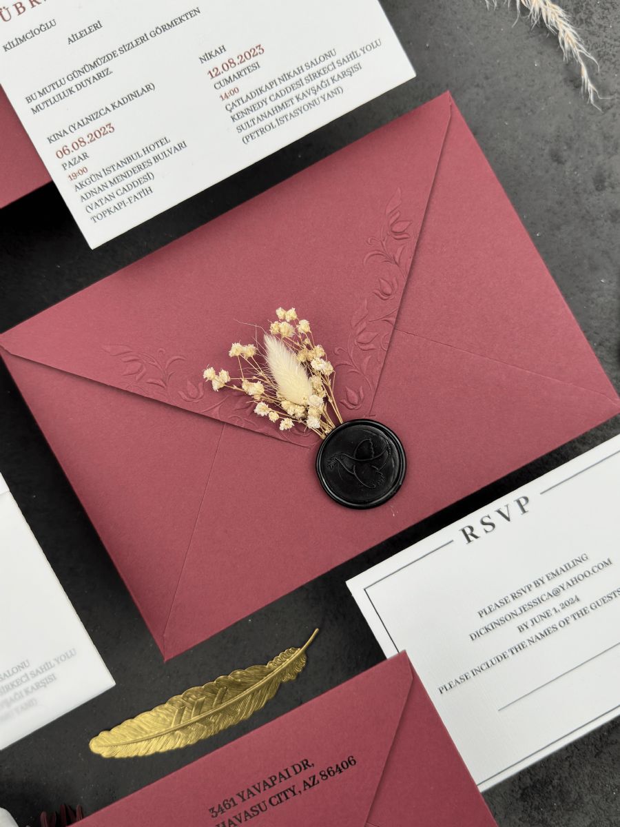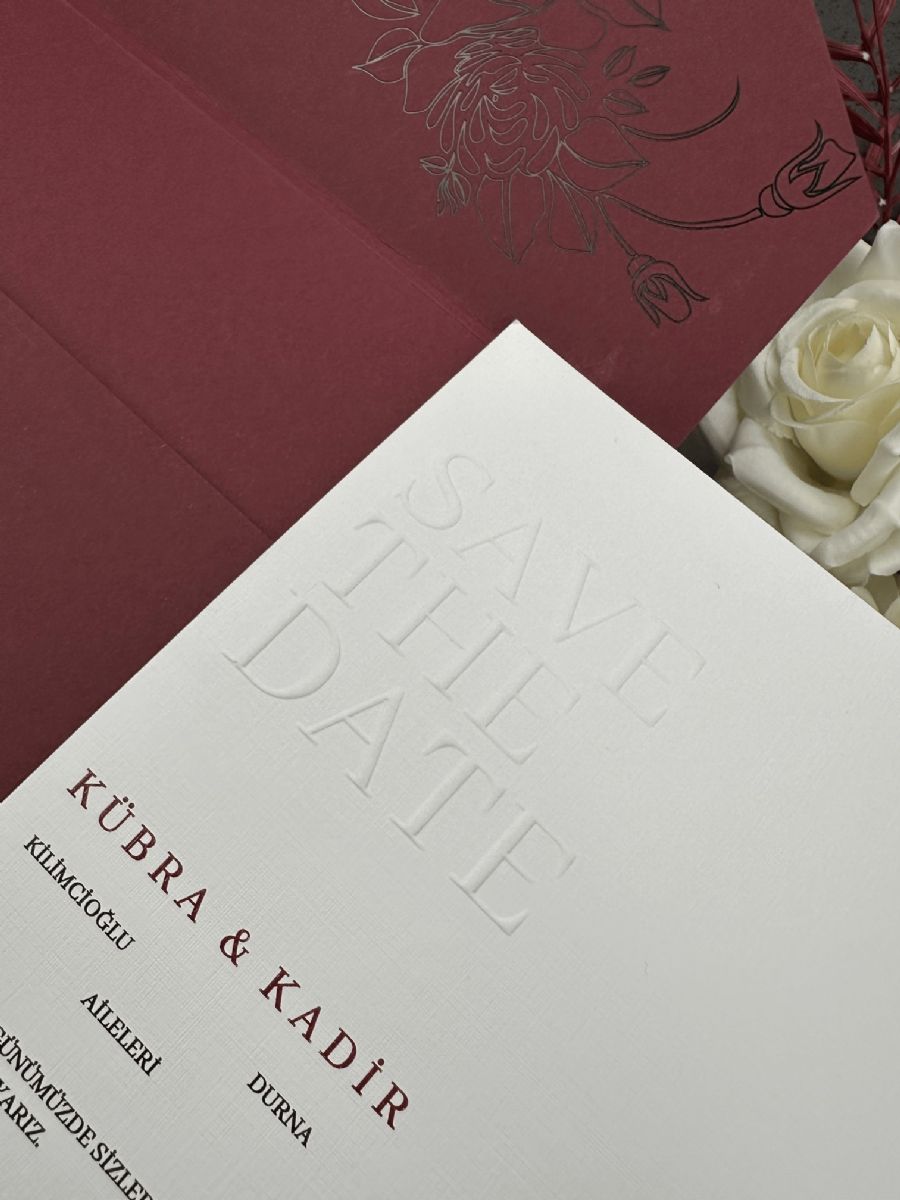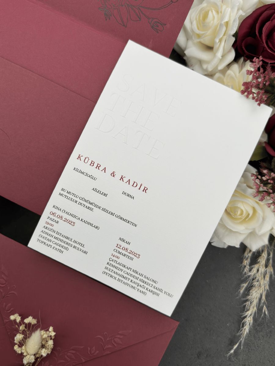 Kabartma Baskılı Bordo Zarflı Save The Date Davetiyesi