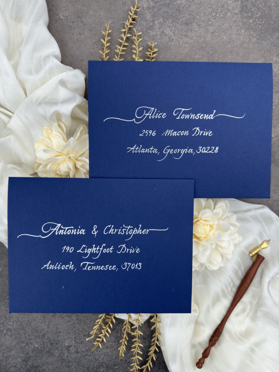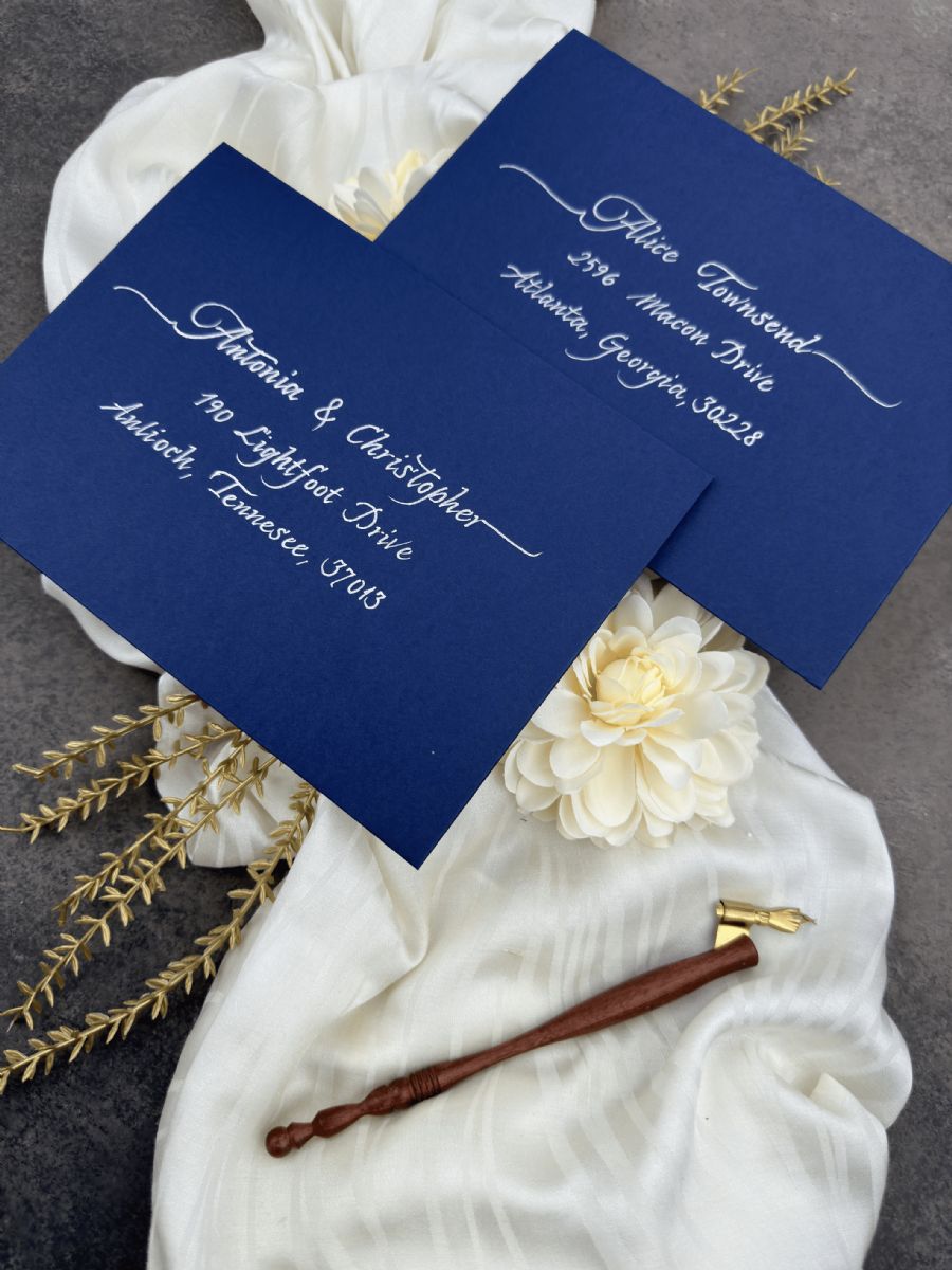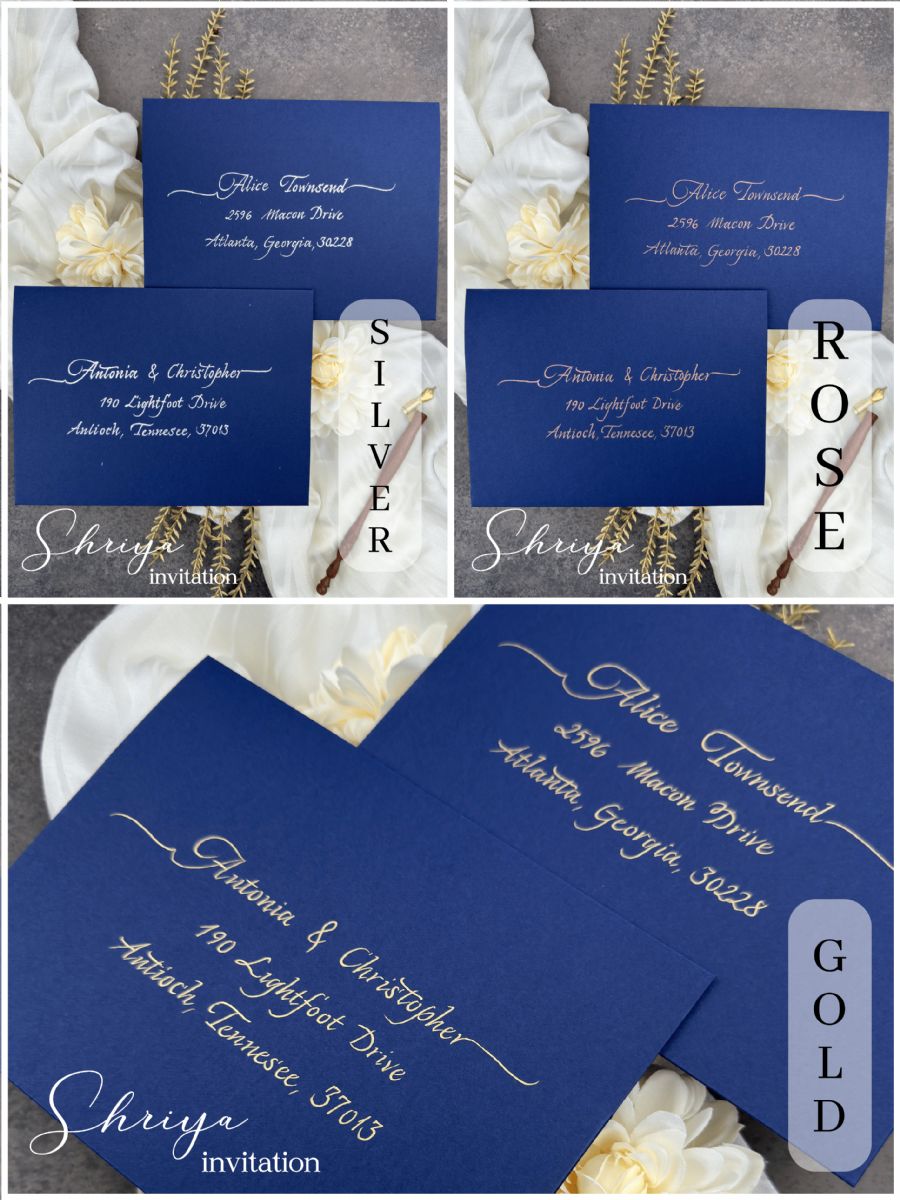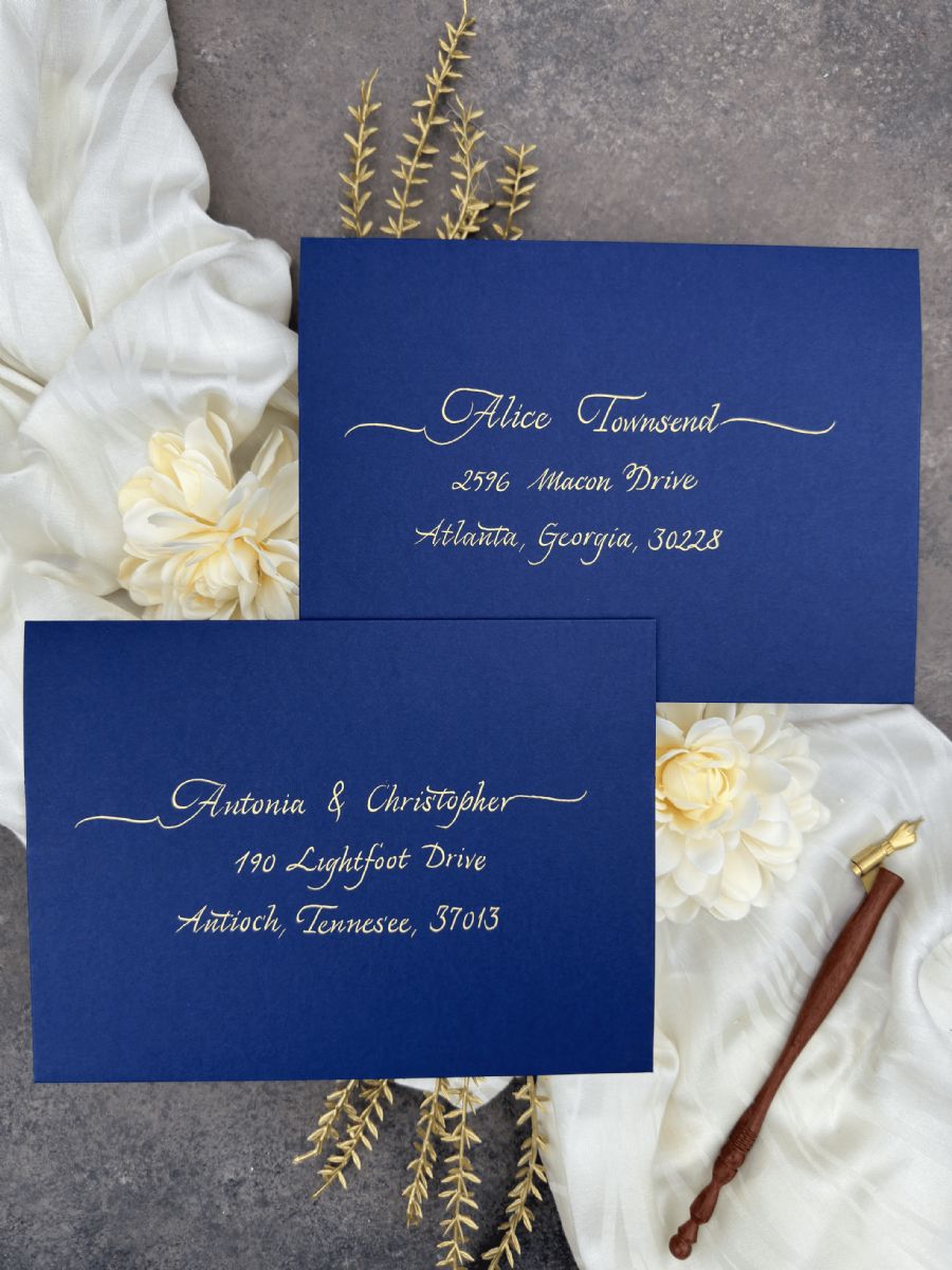 •  Düğün konuğu adres etiketi, Kaligrafi el yazısı konuk adı ve adres baskısı, Zarf üzerinde altın, gümüş, gül renklerinde kaligrafi düğün konuğu adresleri