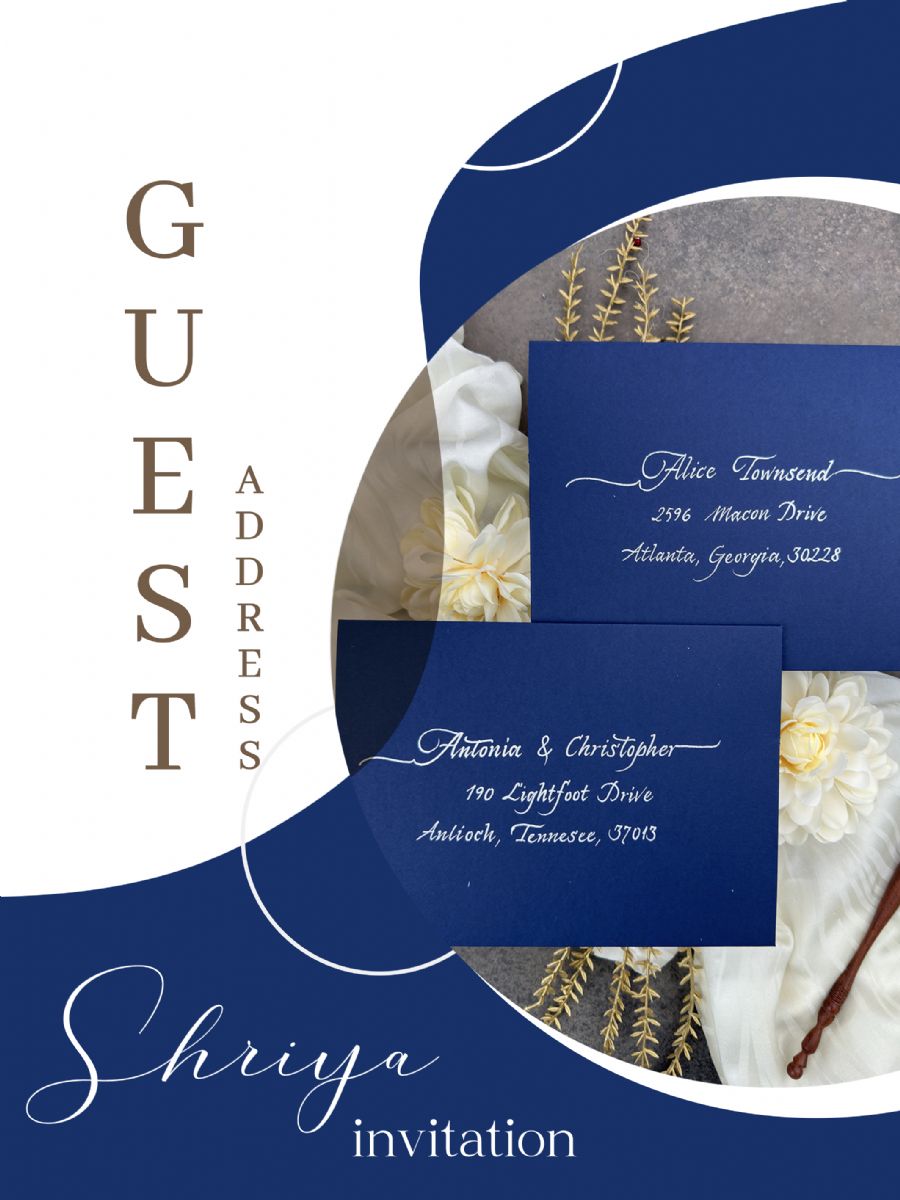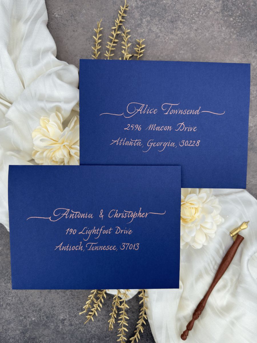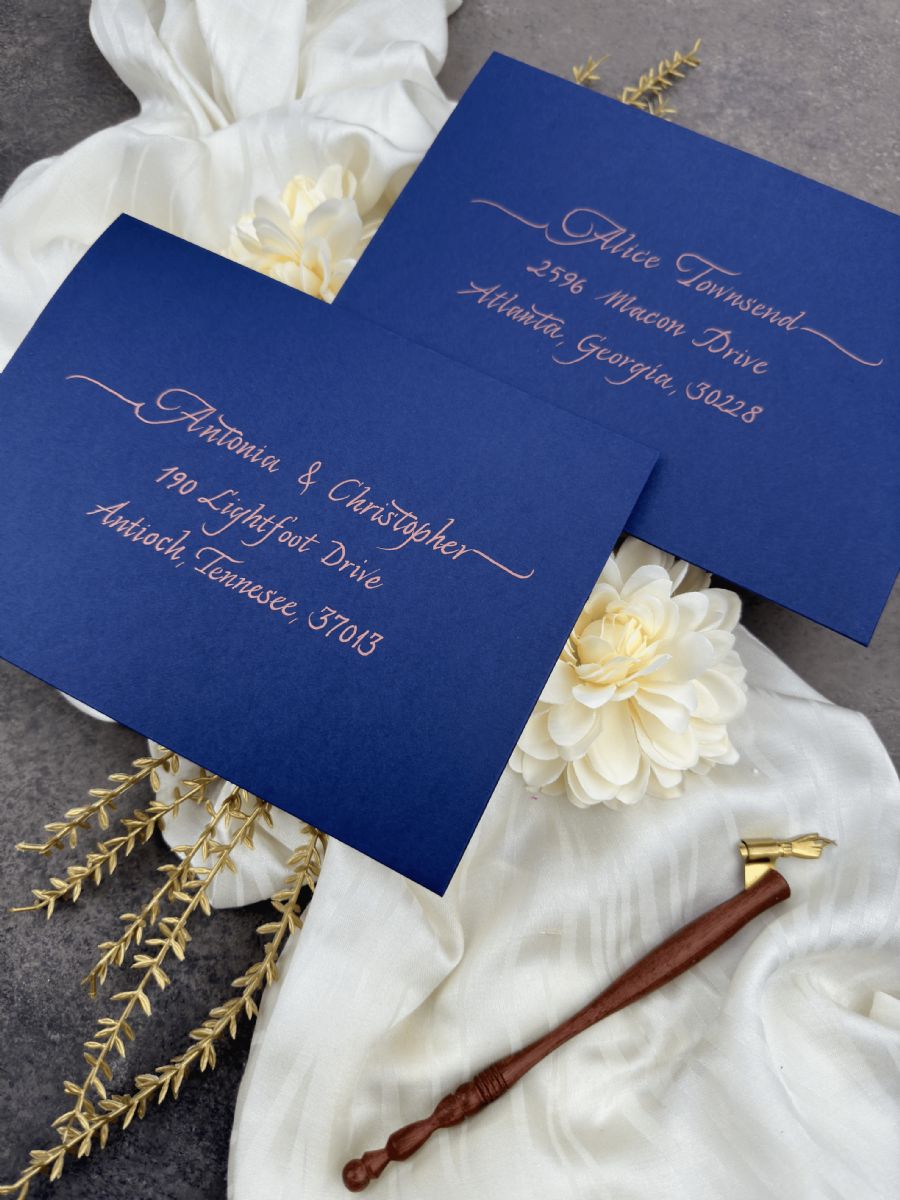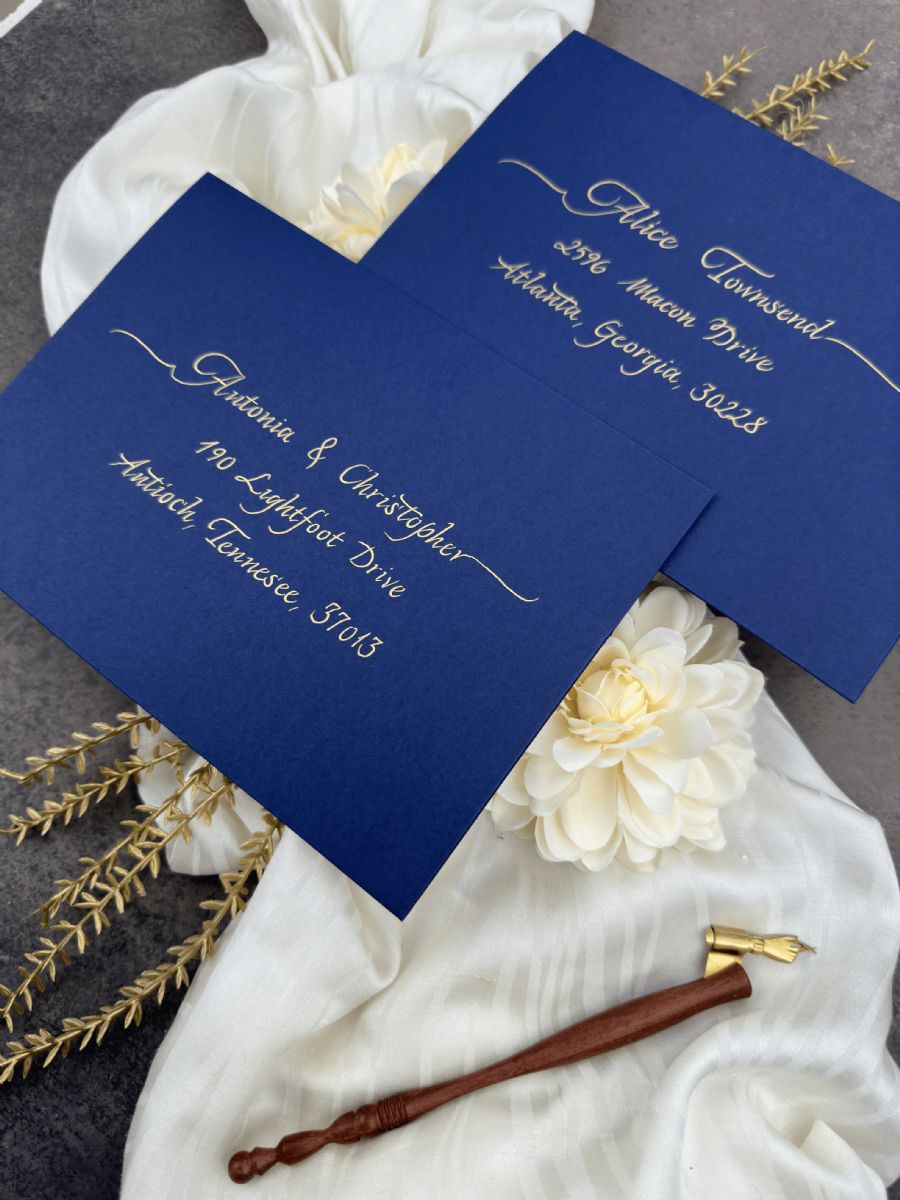 •  Düğün konuğu adres etiketi, Kaligrafi el yazısı konuk adı ve adres baskısı, Zarf üzerinde altın, gümüş, gül renklerinde kaligrafi düğün konuğu adresleri