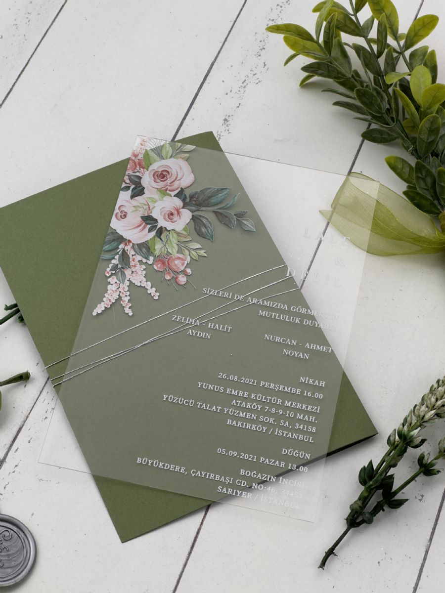 Pembe Uv Baskılı Ve Yaldız Baskılı Şeffaf Akrilik Düğün Davetiyesi