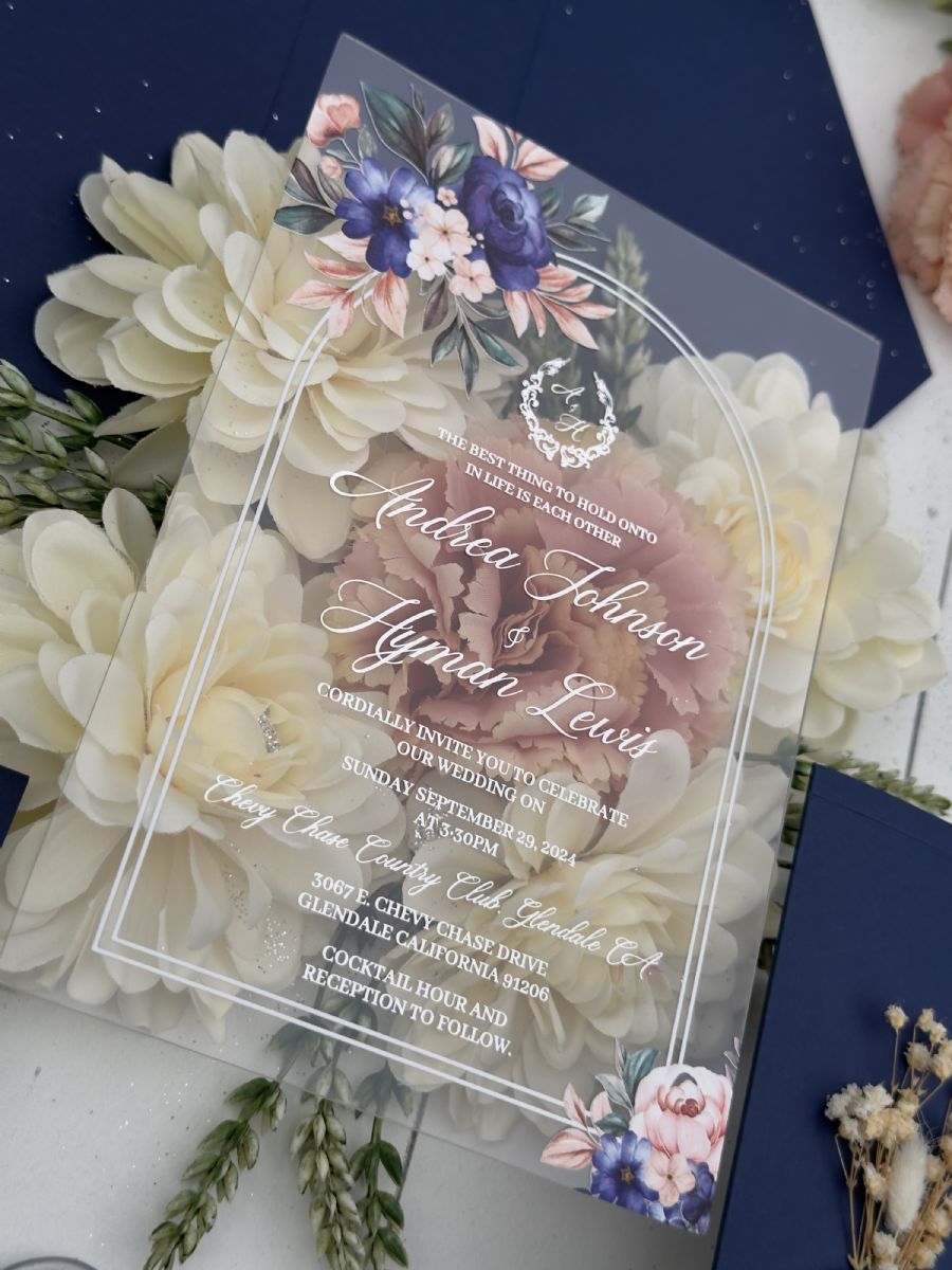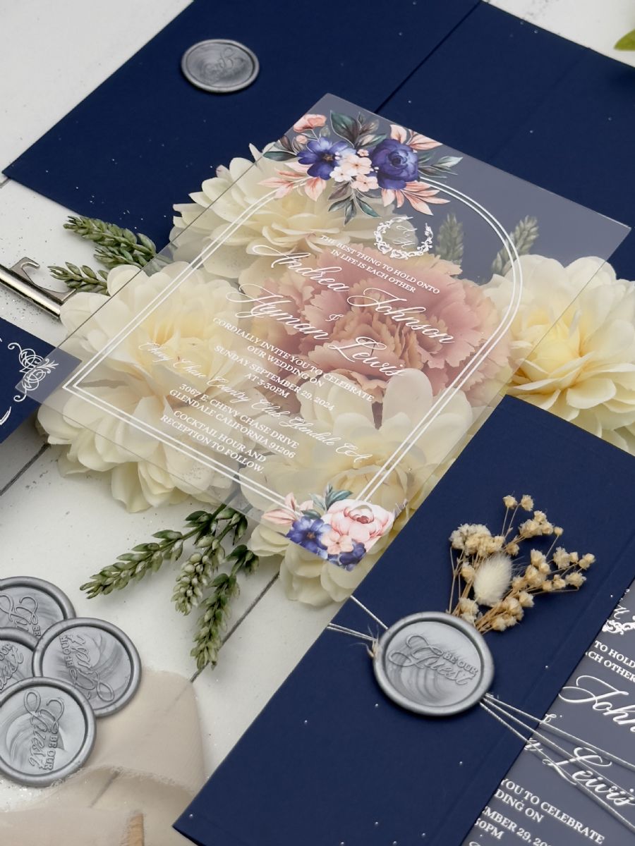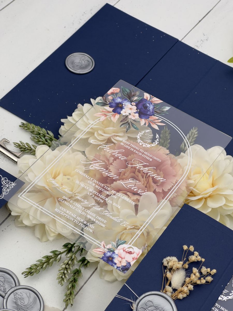 Renkli Çiçek Ve Gümüş Yaldızlı Şeffaf Pleksi Düğün Davetiyesi