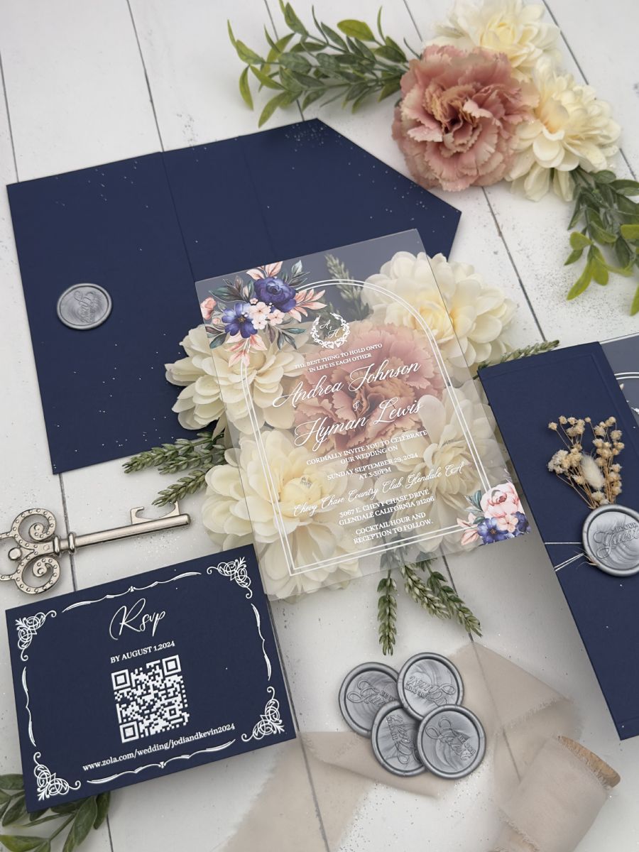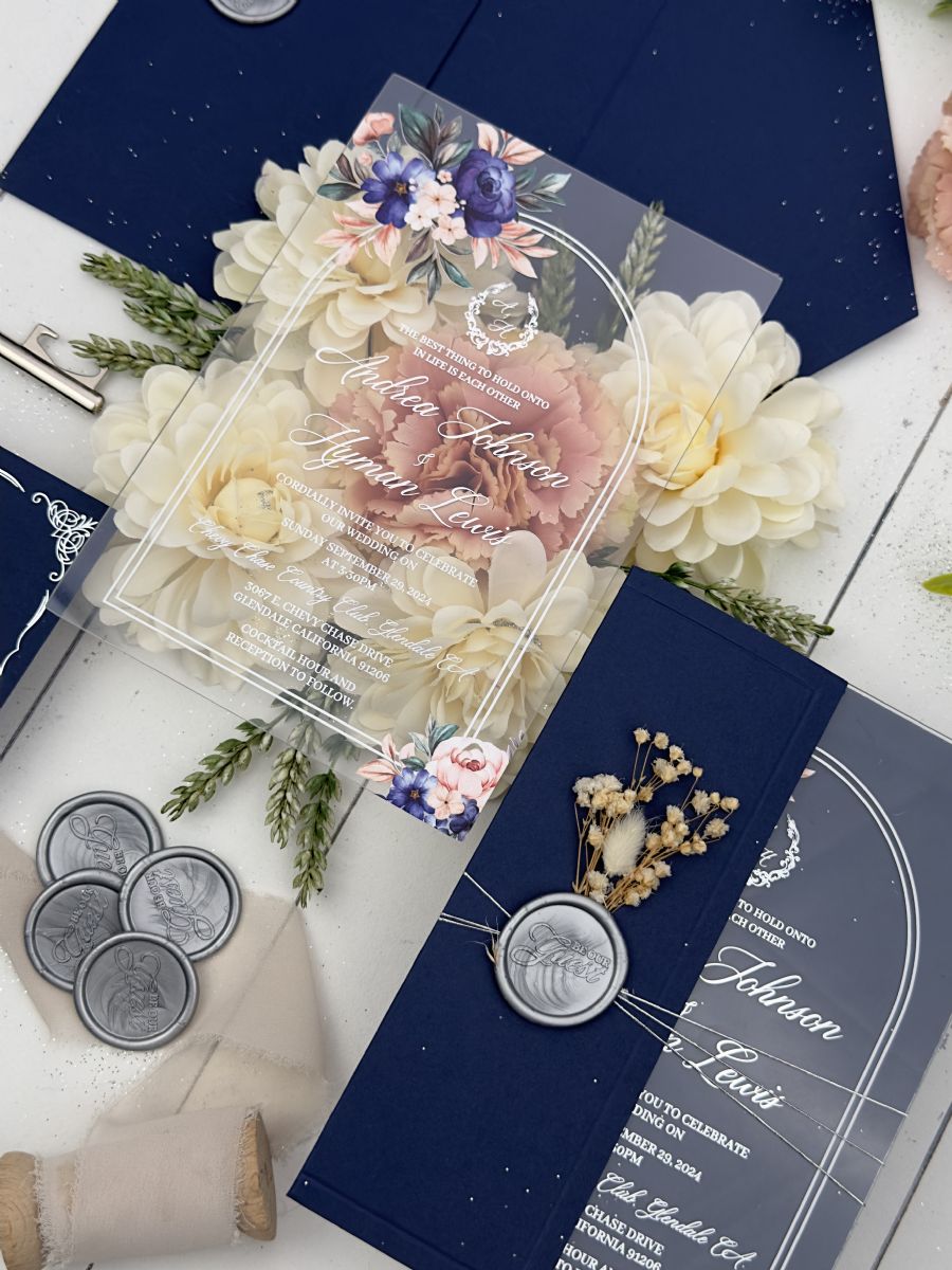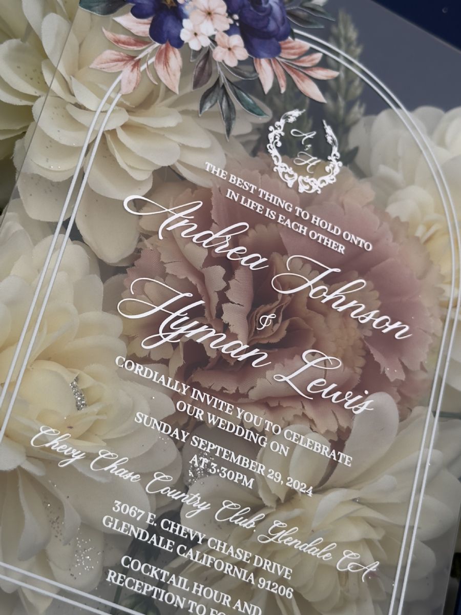 Renkli Çiçek Ve Gümüş Yaldızlı Şeffaf Pleksi Düğün Davetiyesi
