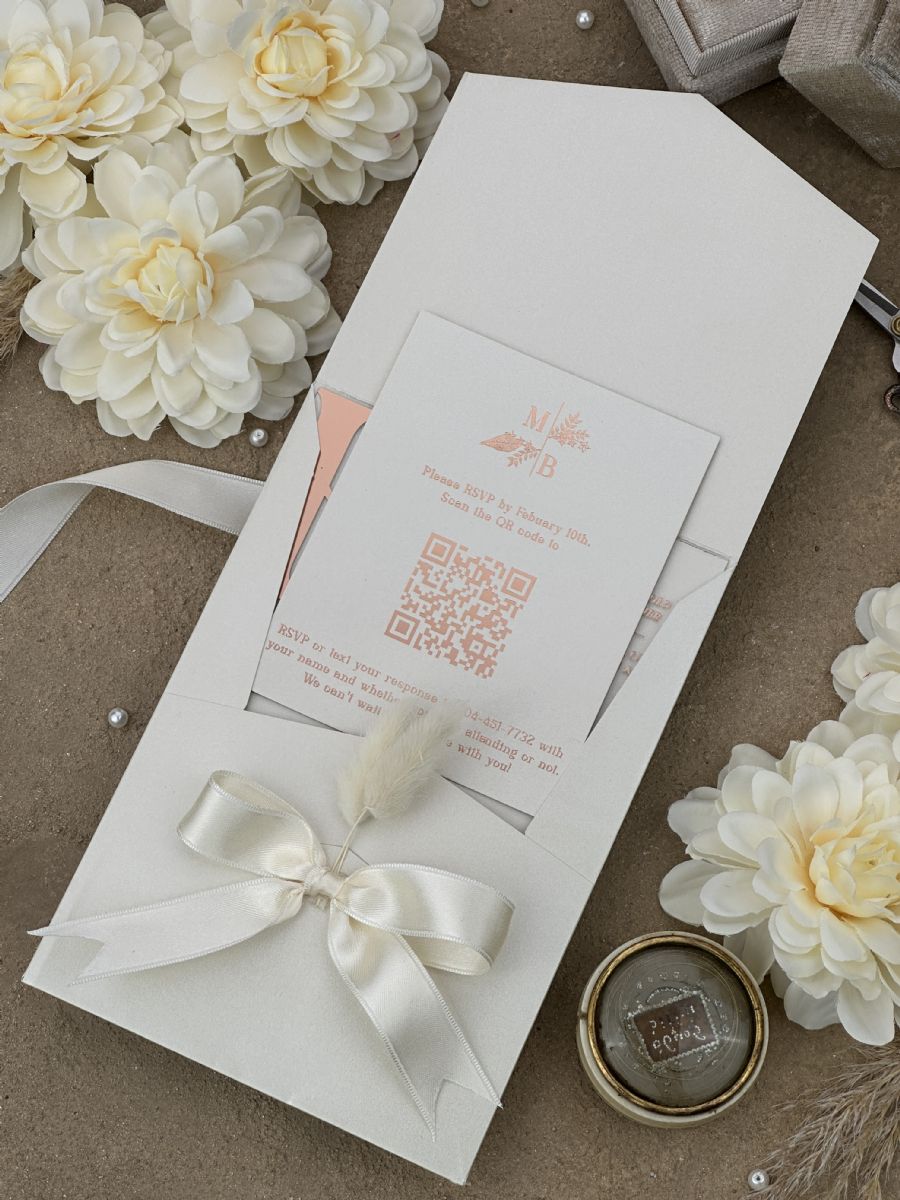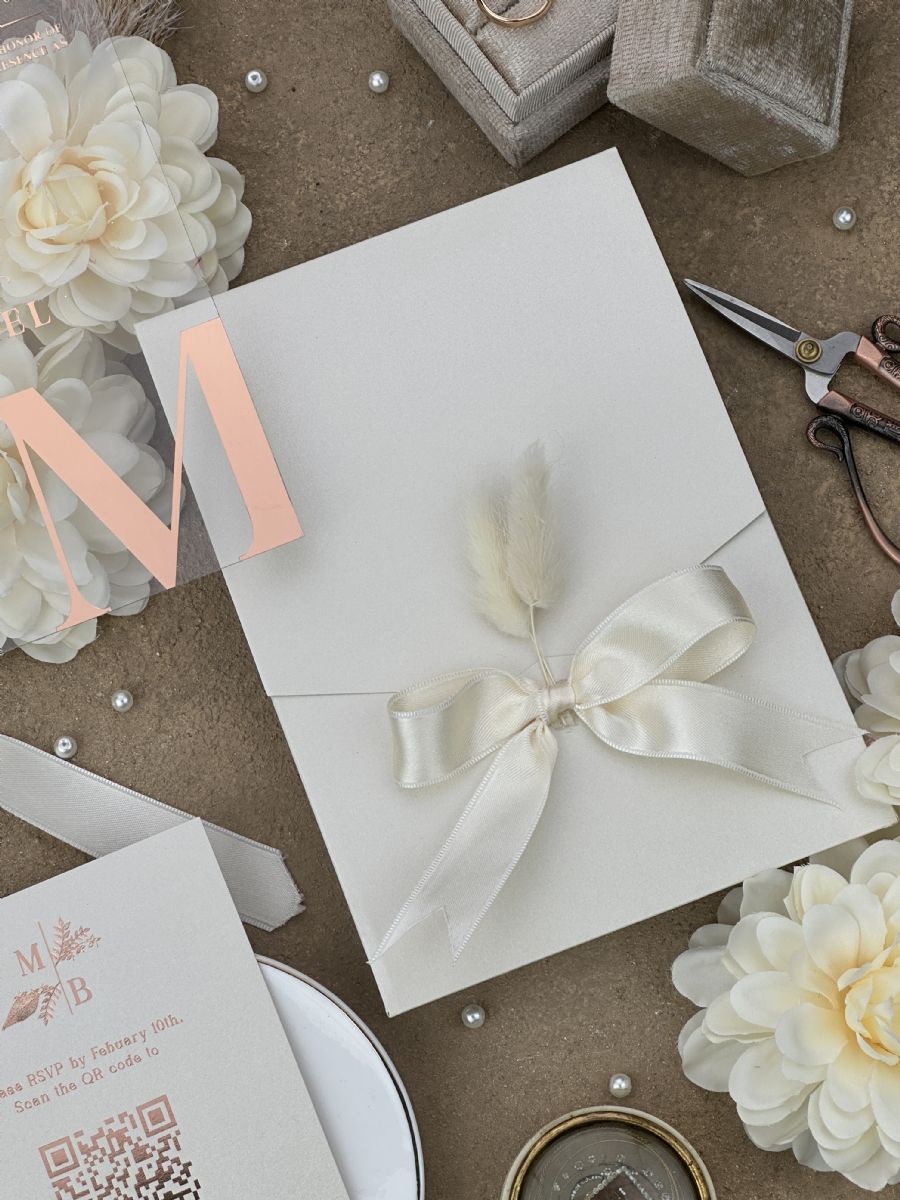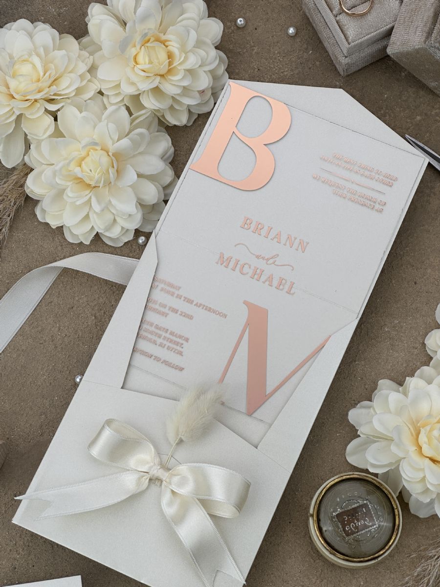 Rose Yaldız Baskılı Ve Kurdele Süslemeli Düğün Davetiyesi