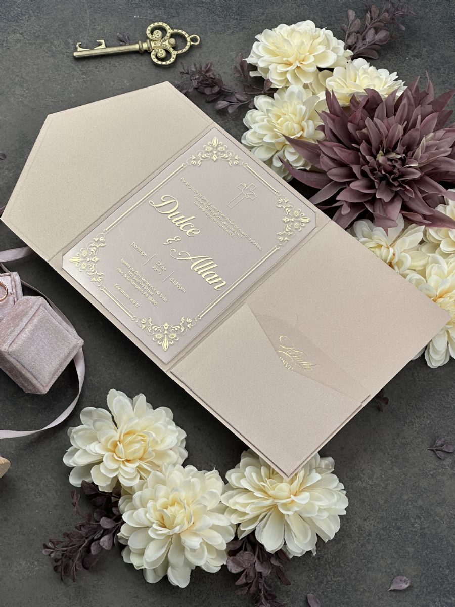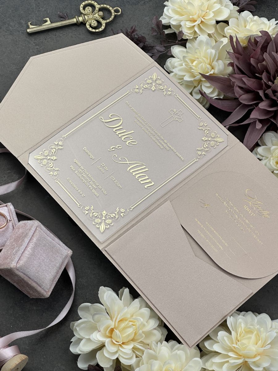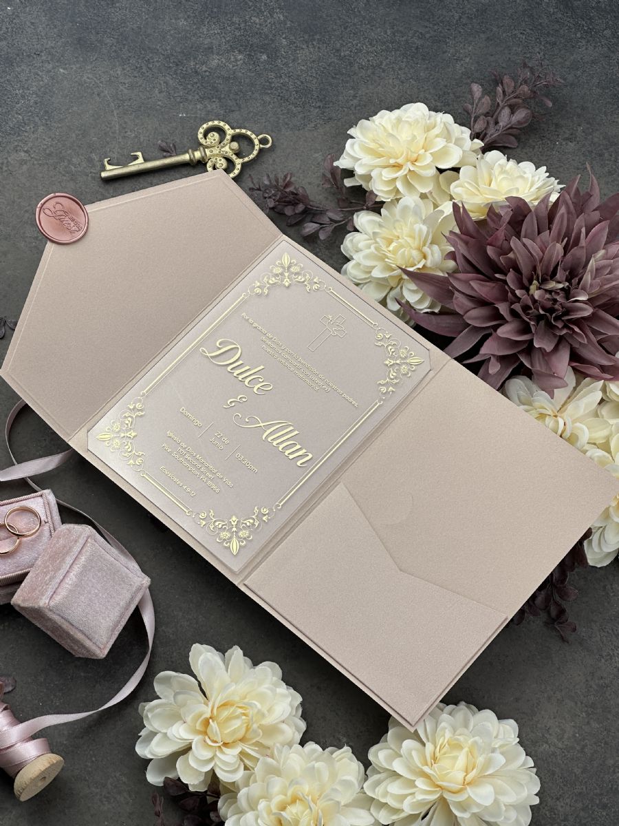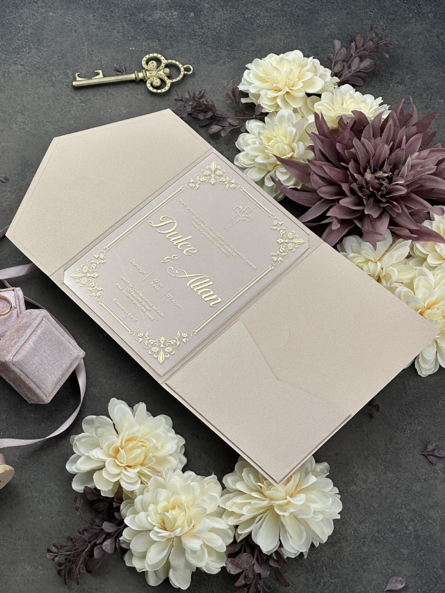 Şampanya Rengi Cepli Zarflı Şeffaf Akrilik Düğün Davetiyesi
