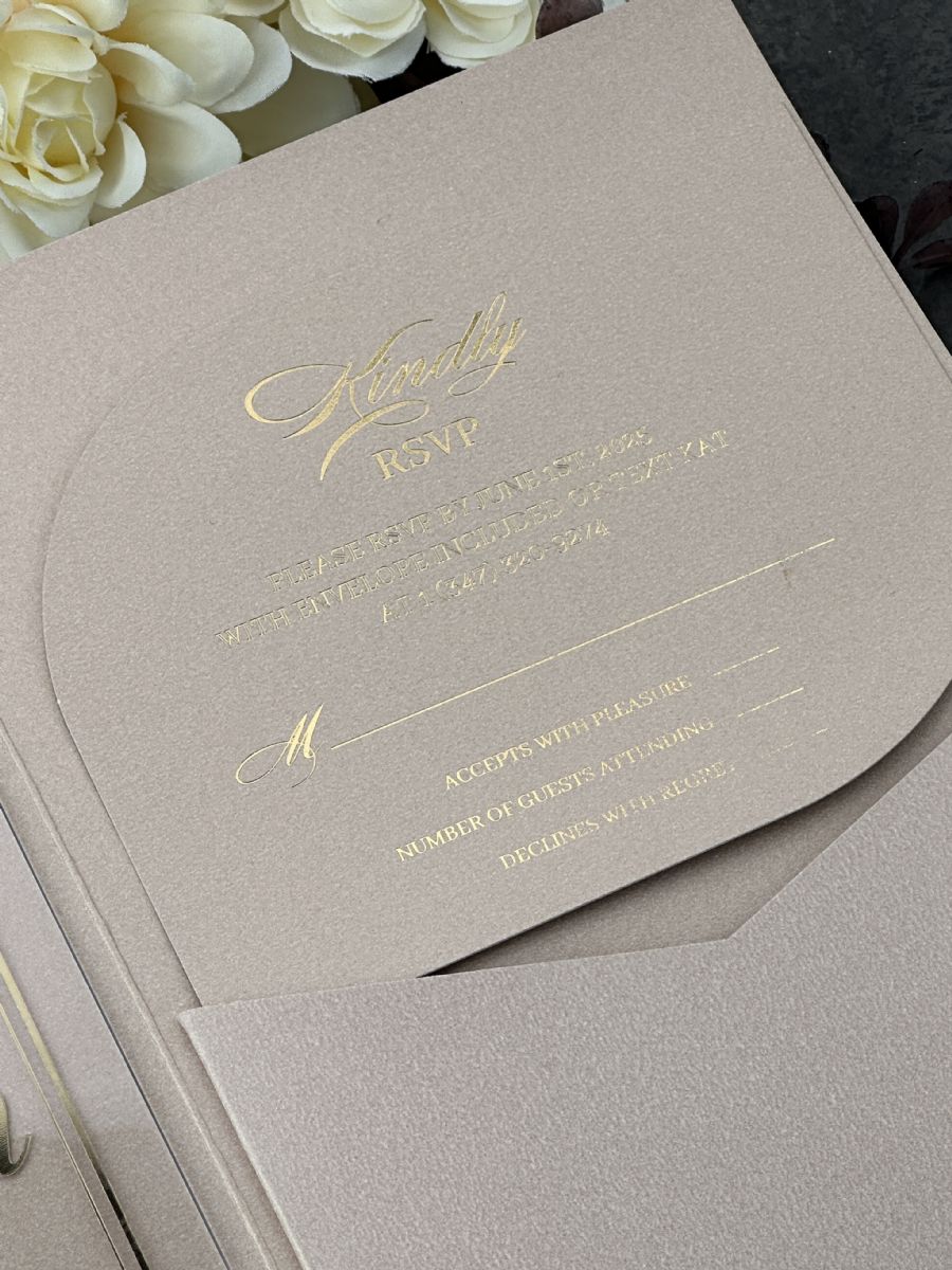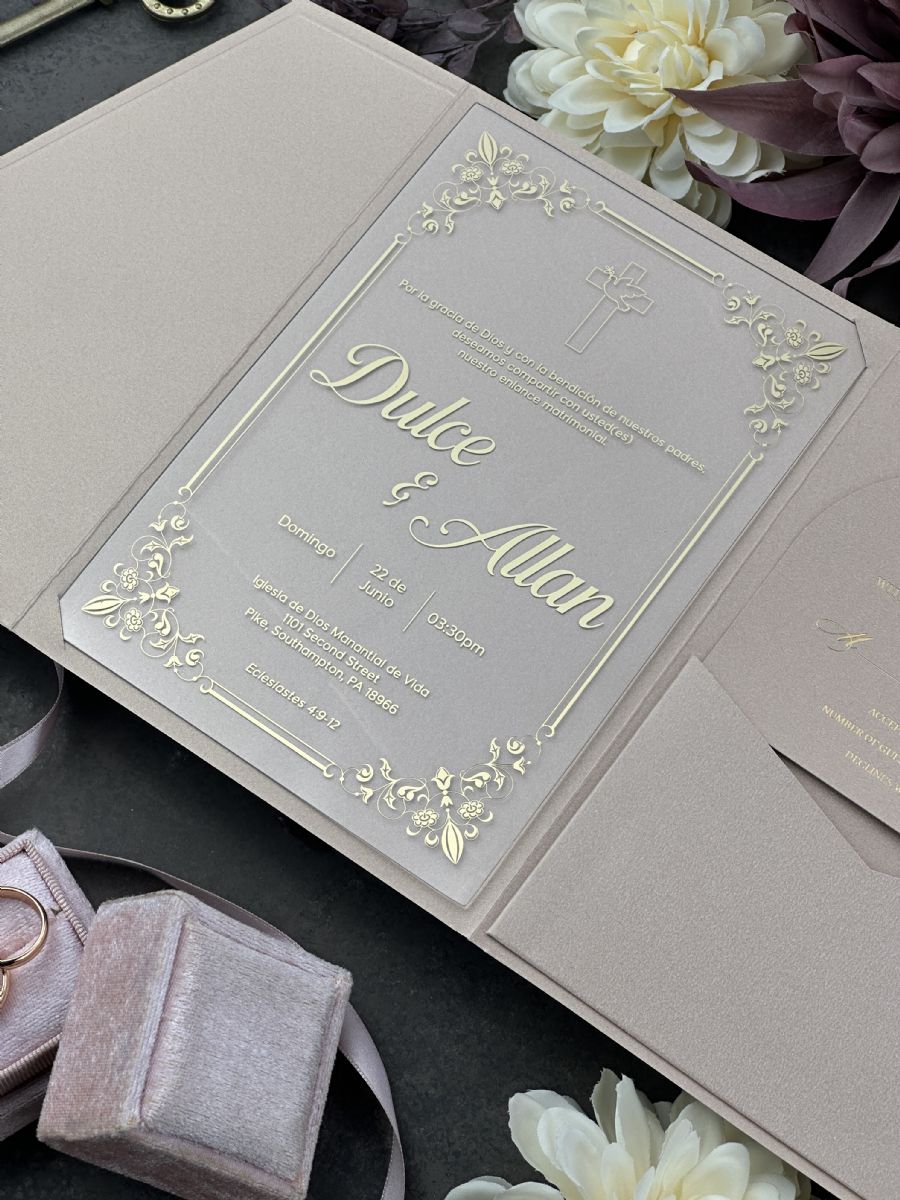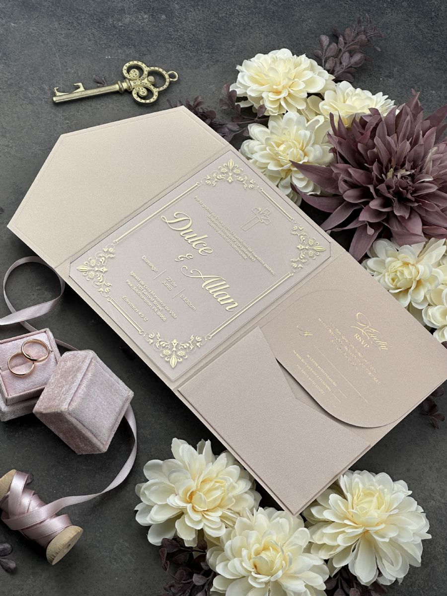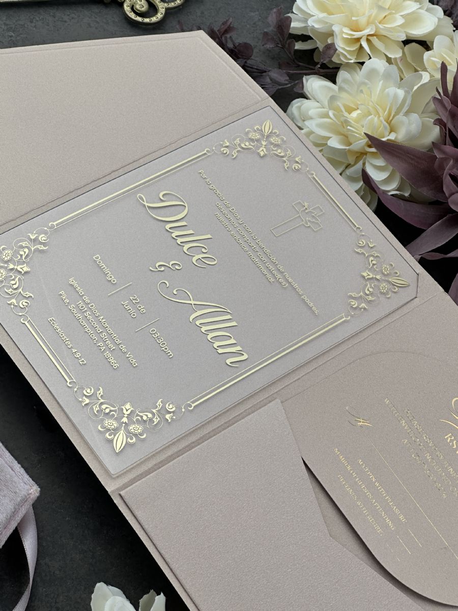 Şampanya Rengi Cepli Zarflı Şeffaf Akrilik Düğün Davetiyesi