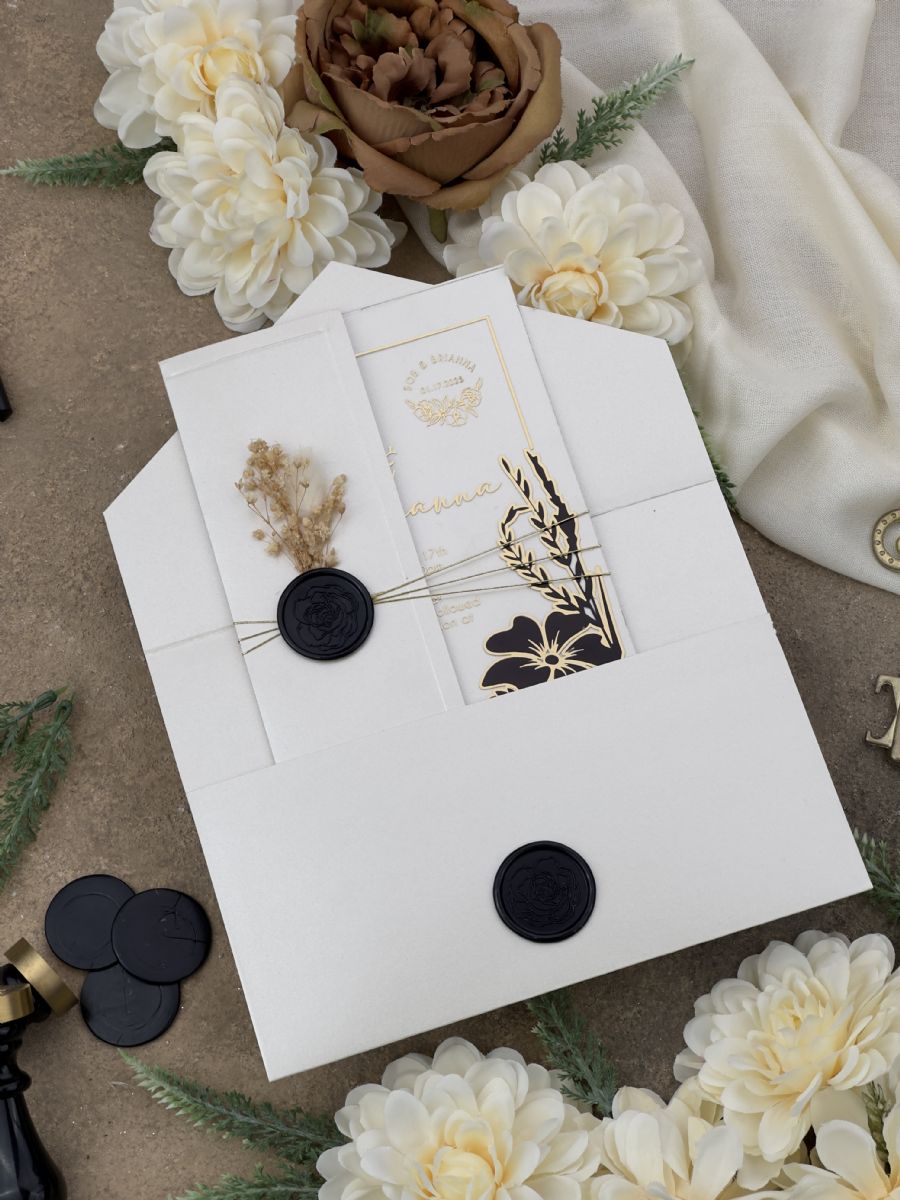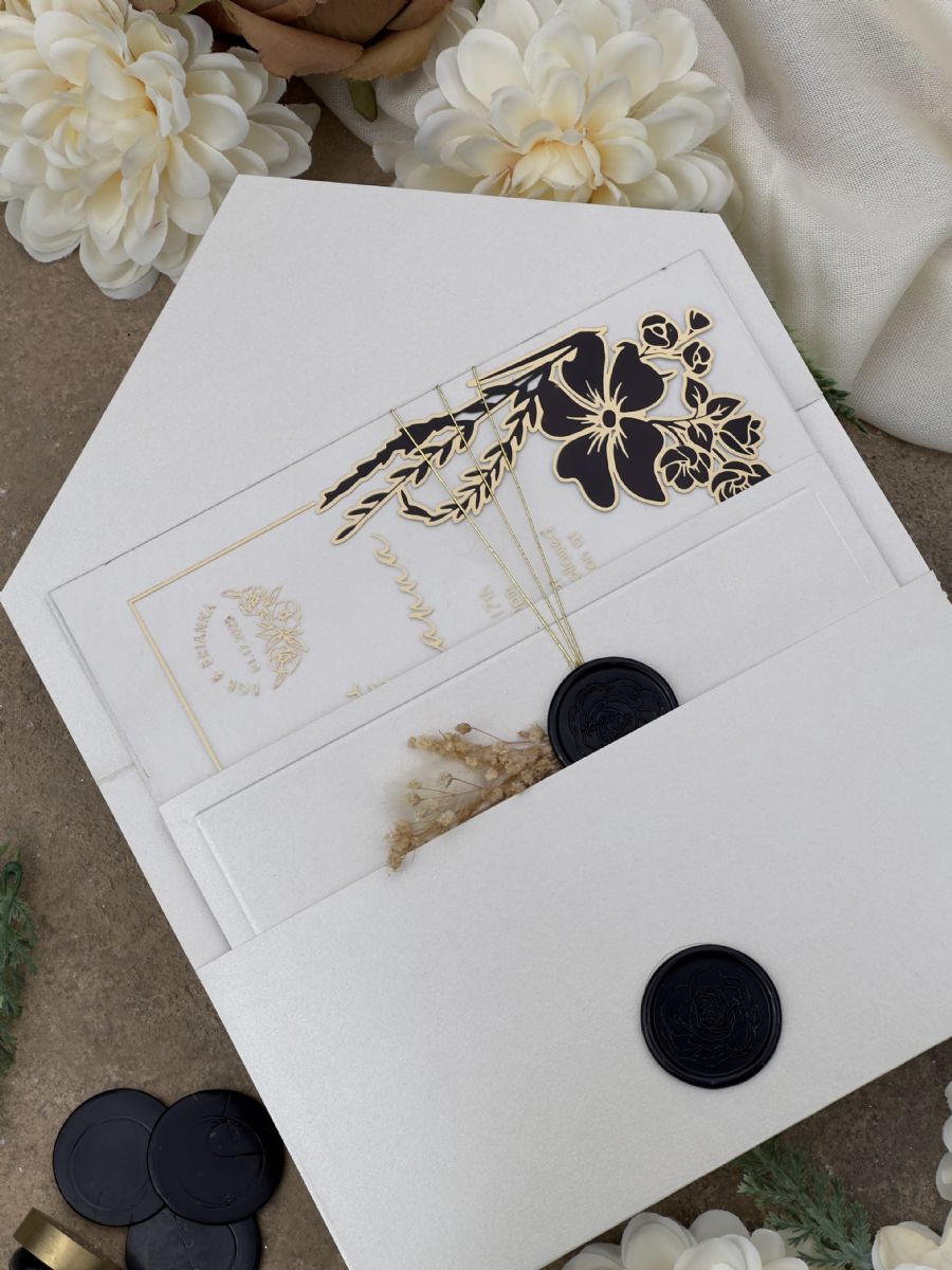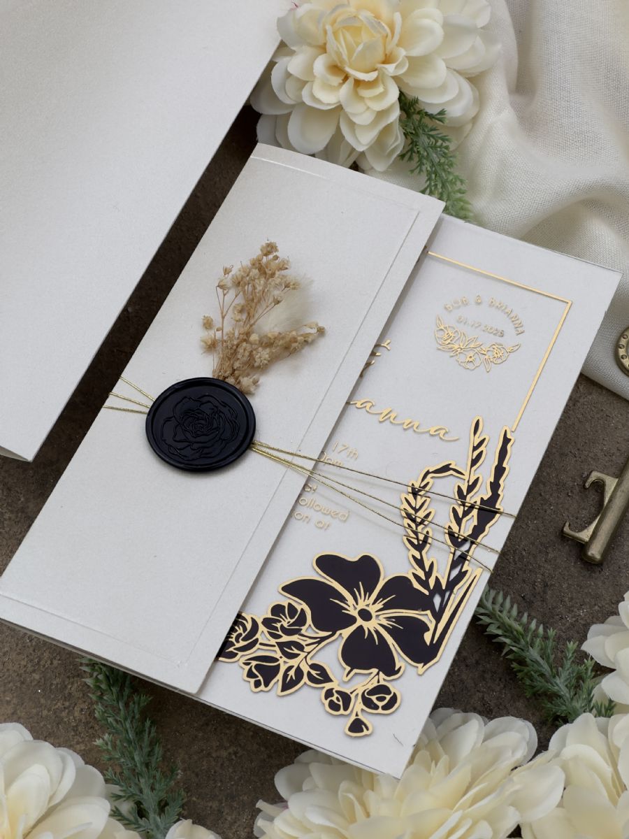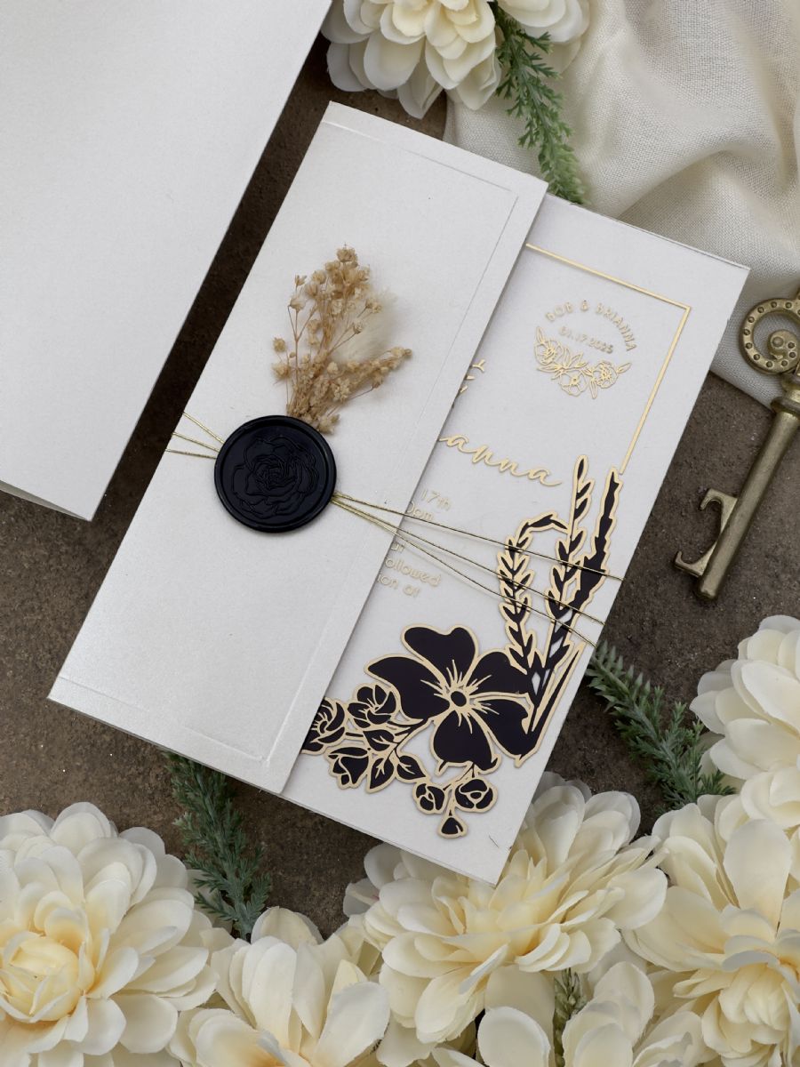 Siyah Ve Altın Baskı Detaylı Yarım Kapaklı Modern Düğün Davetiyesi