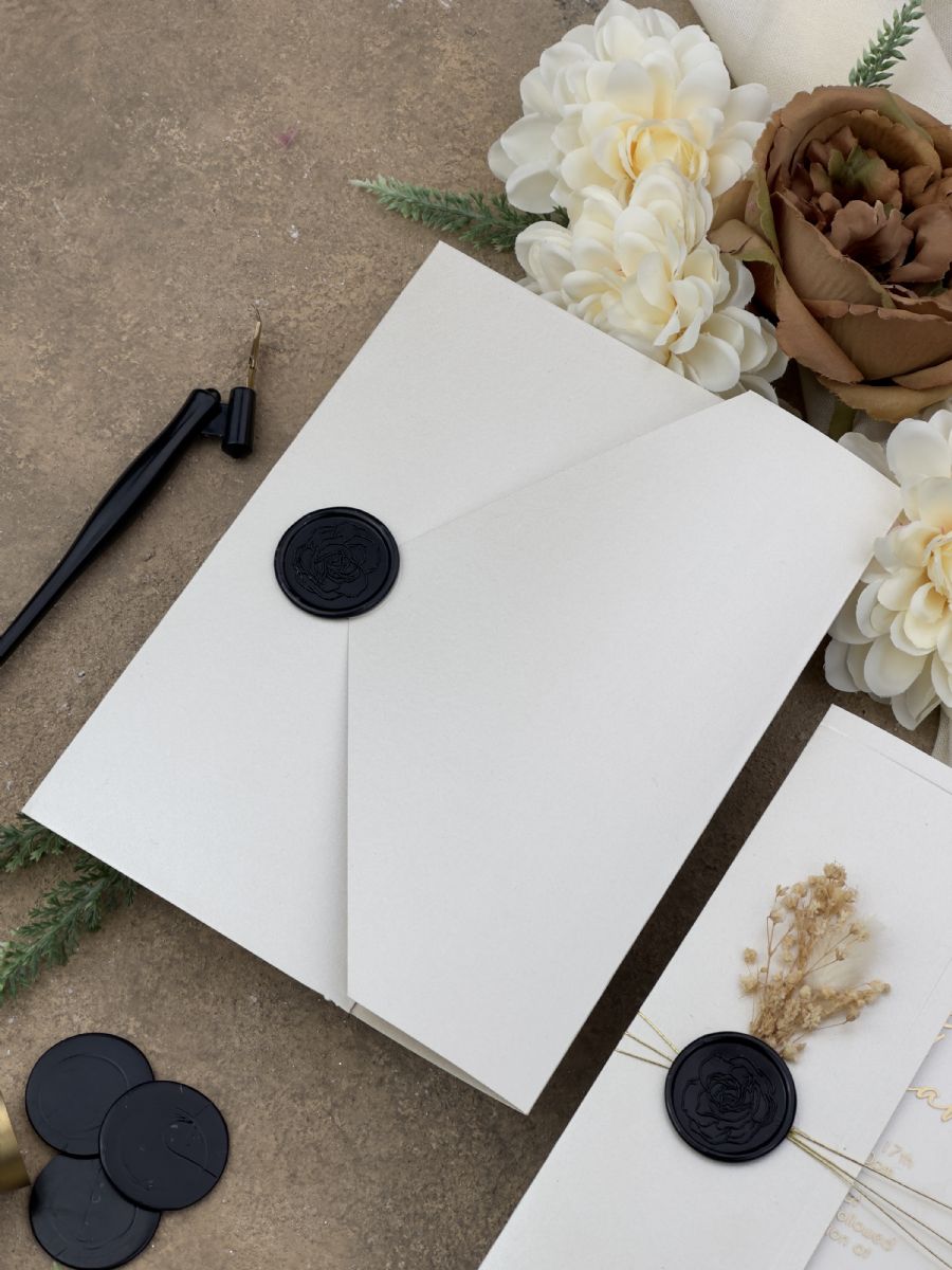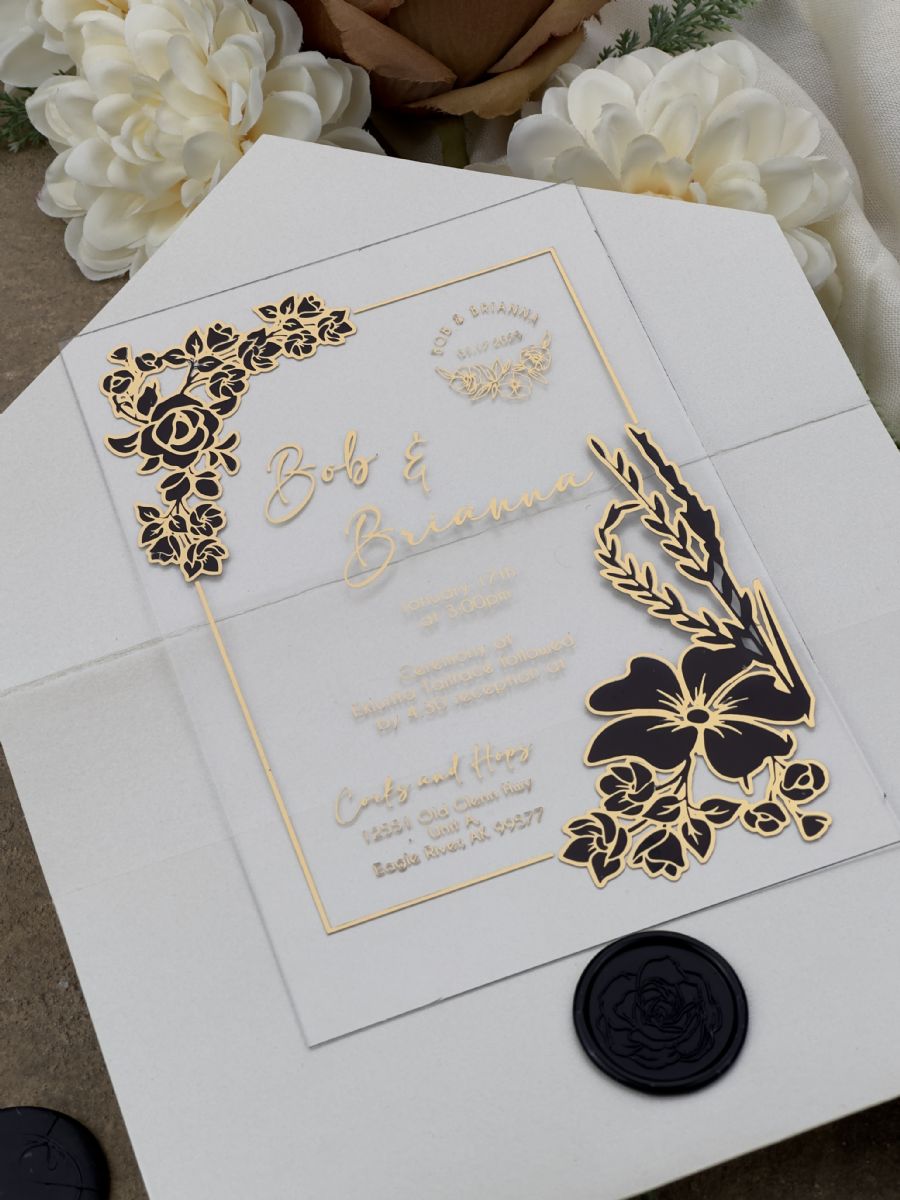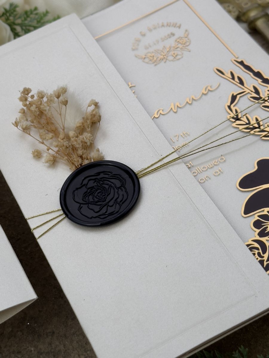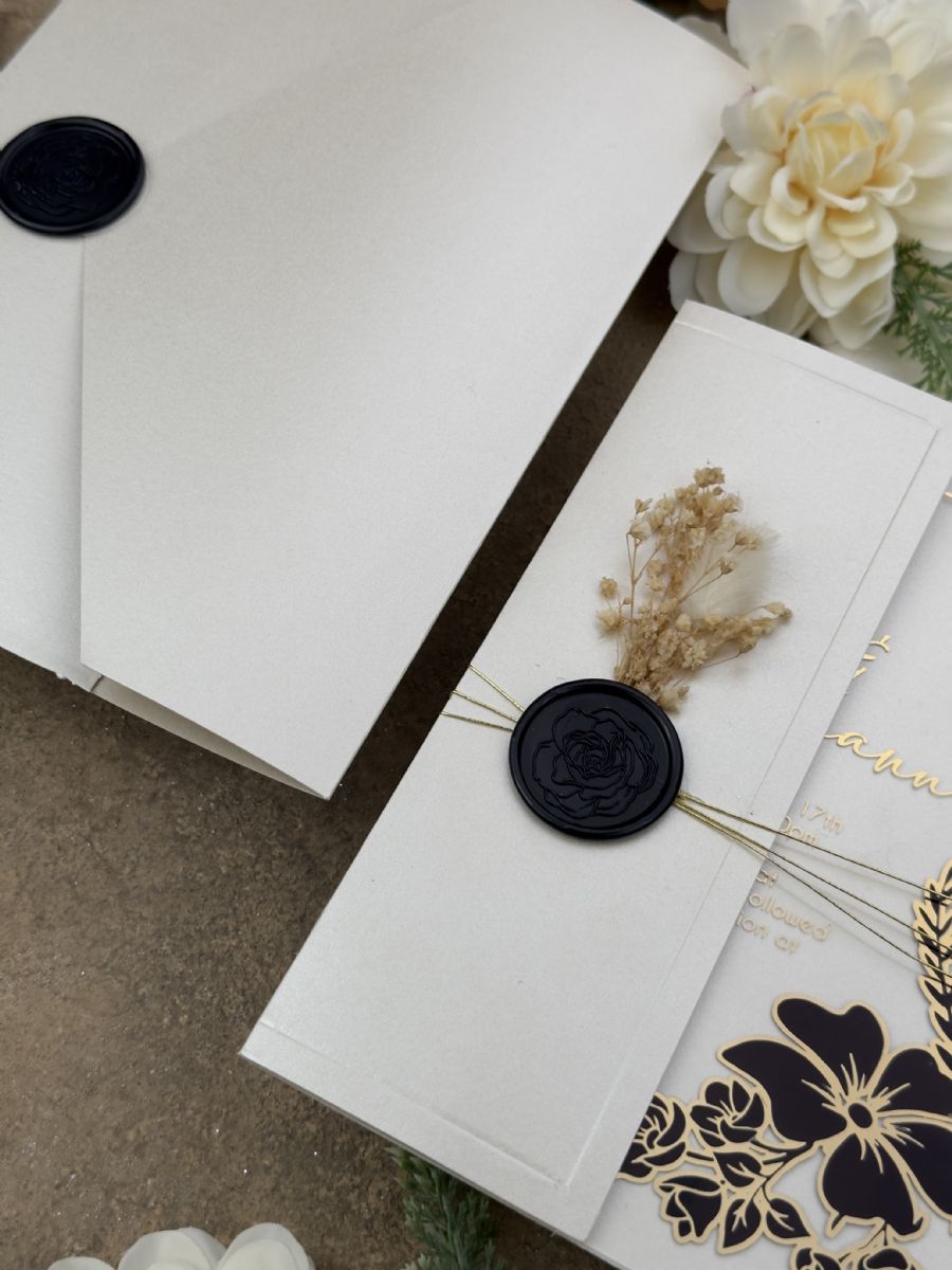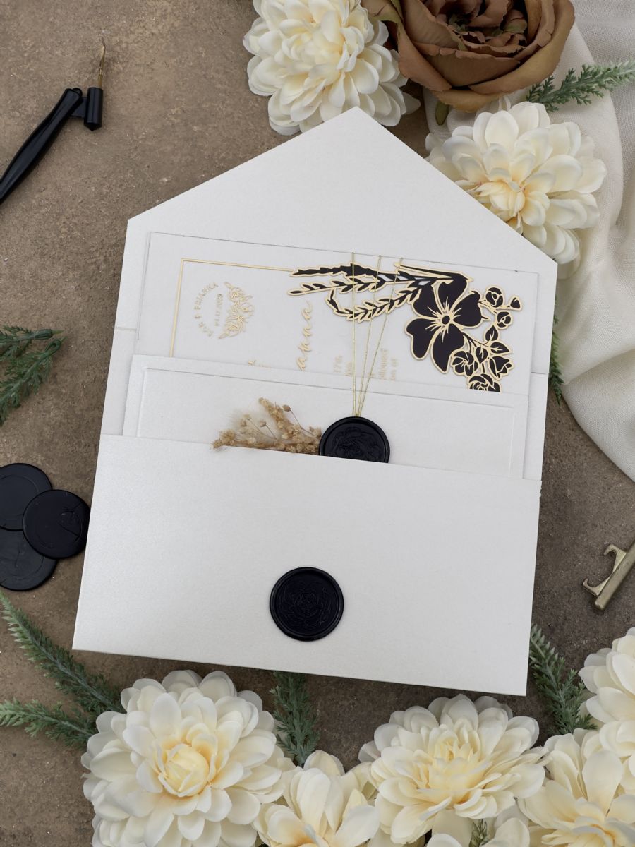 Siyah Ve Altın Baskı Detaylı Yarım Kapaklı Modern Düğün Davetiyesi