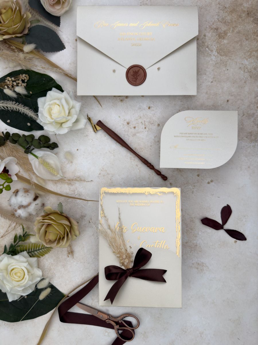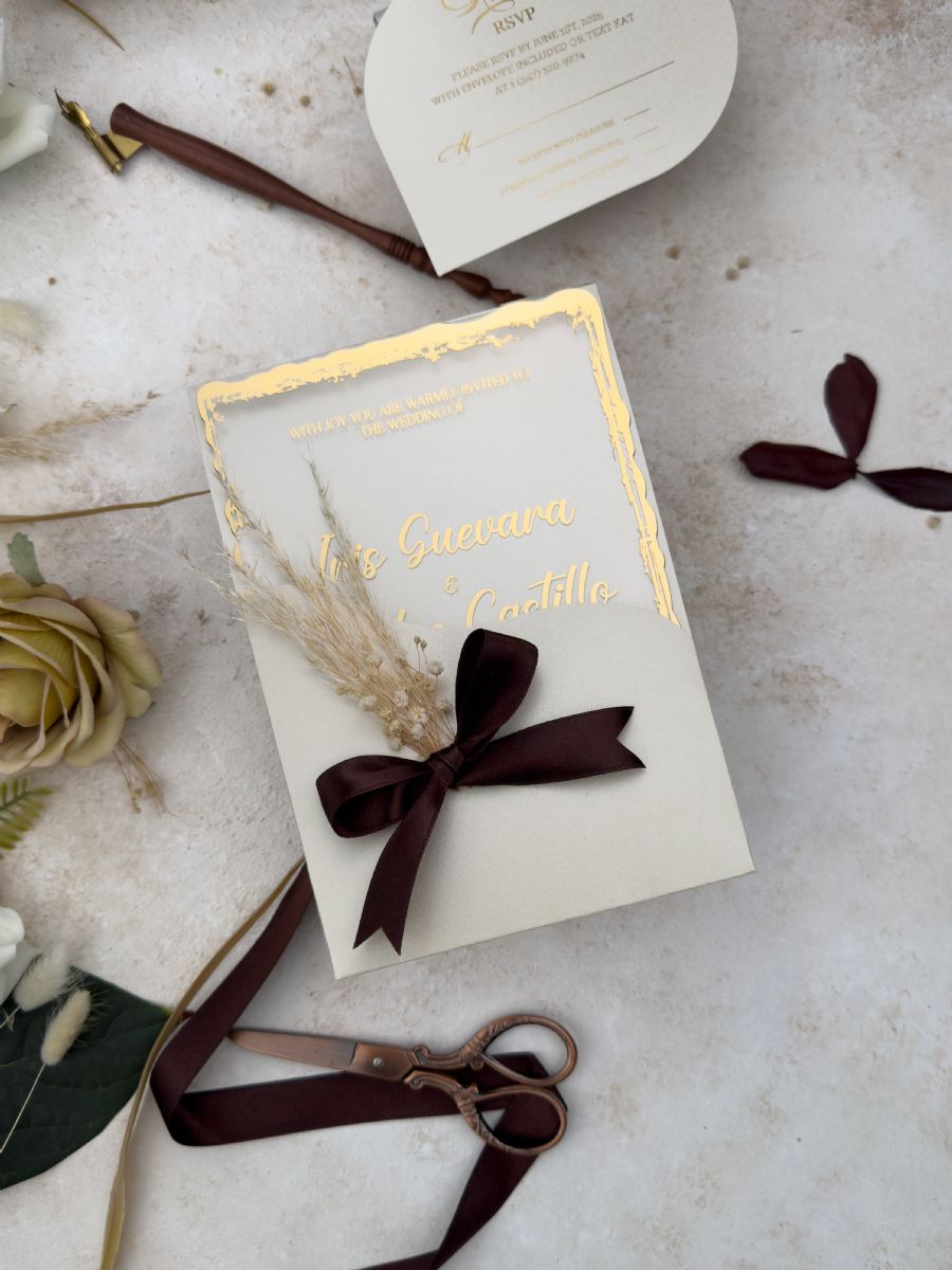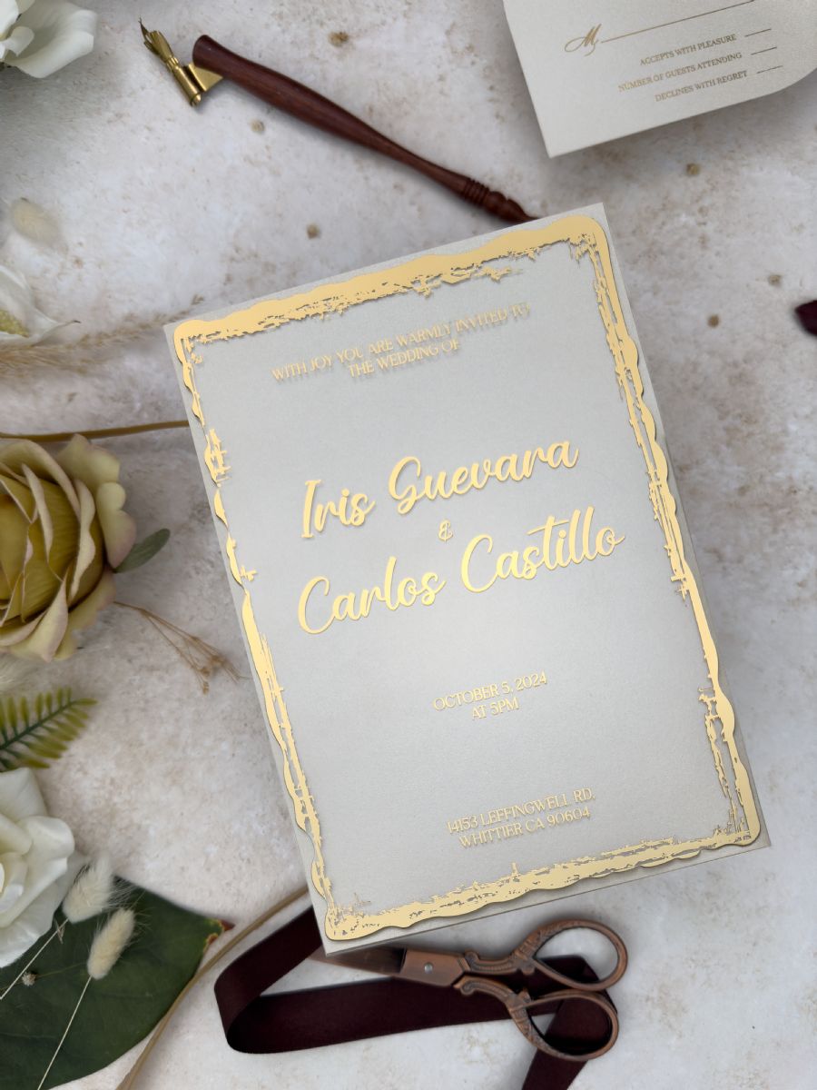 Tırtıklı Kesim Altın Baskılı Akrilik Düğün Davetiyesi