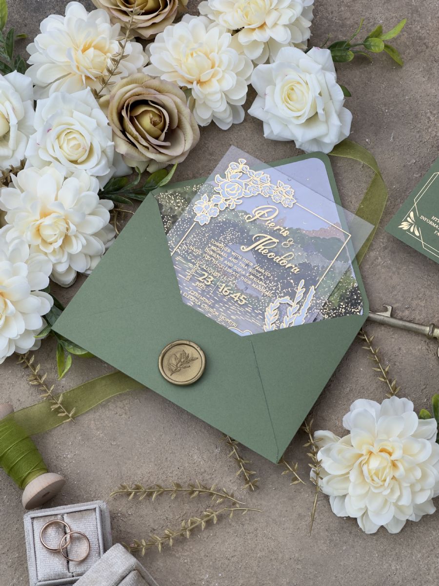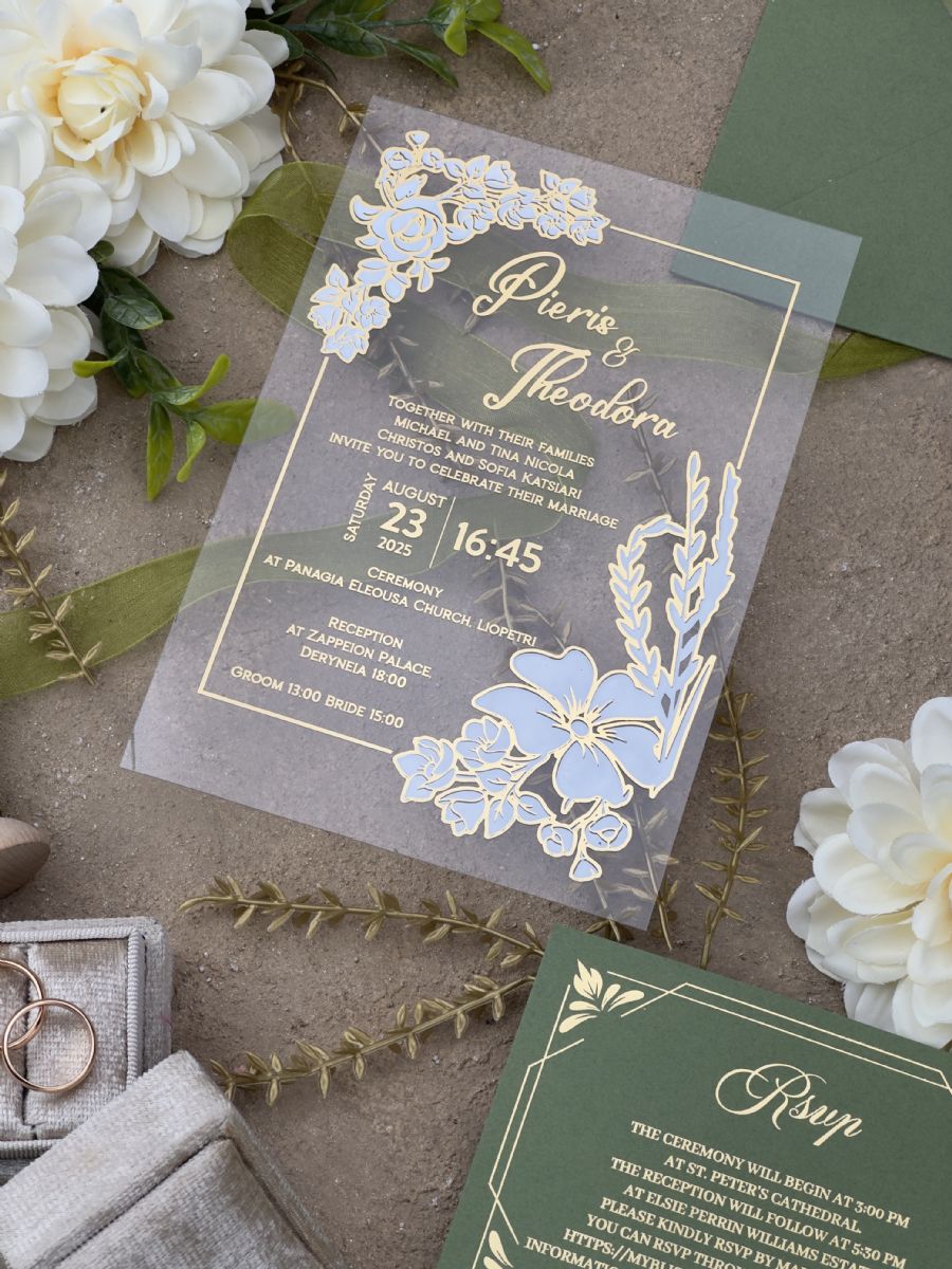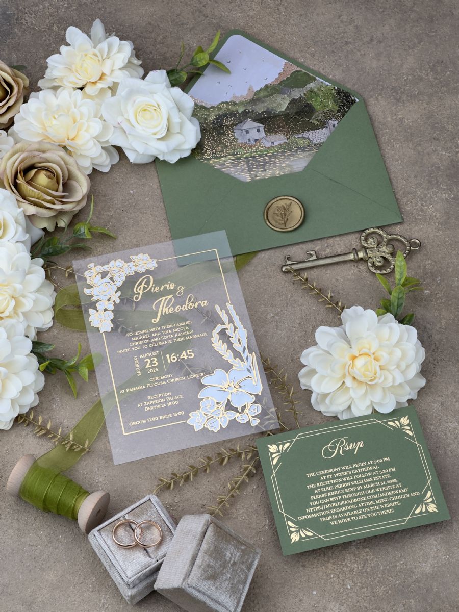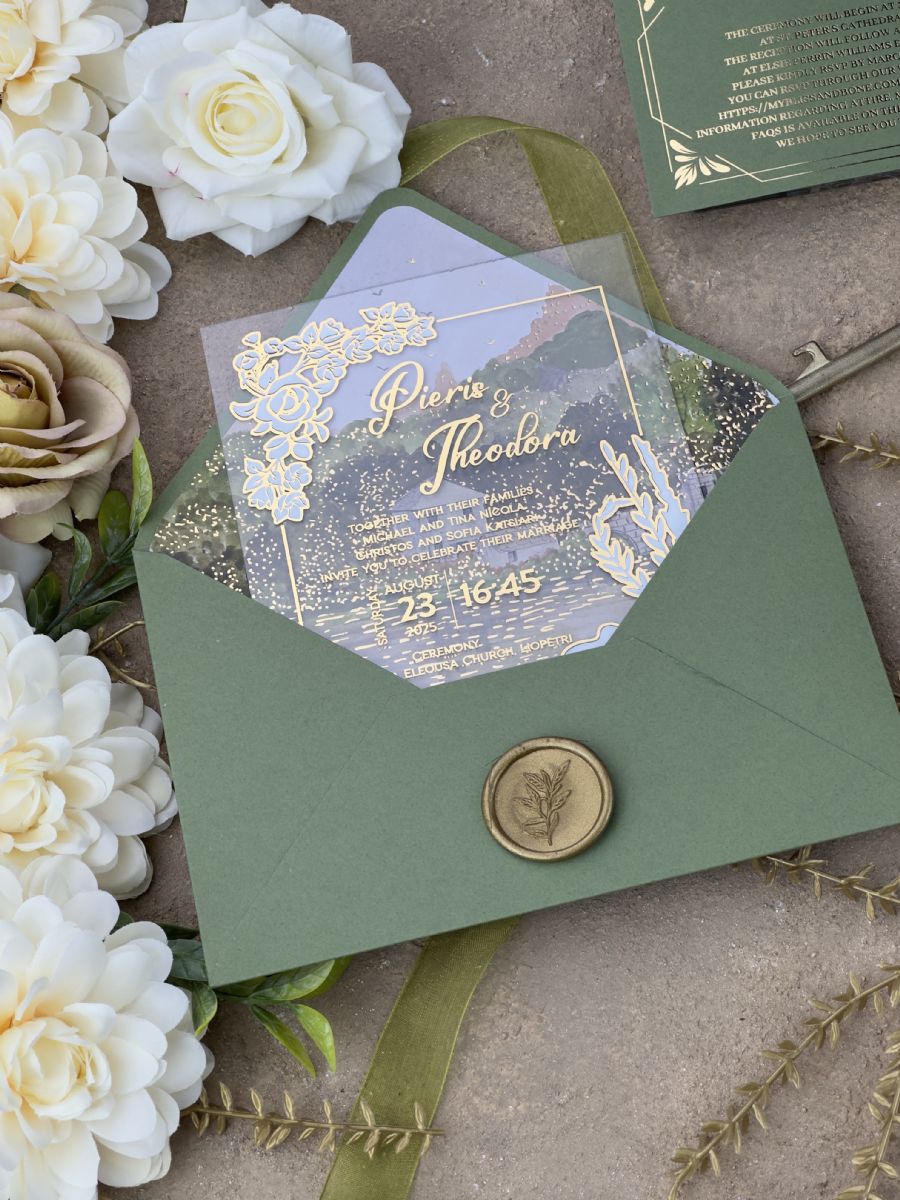 Yeşil Doğa Temalı Sulu Boyalı Çift Yaldız Baskılı Akrilik Davetiye