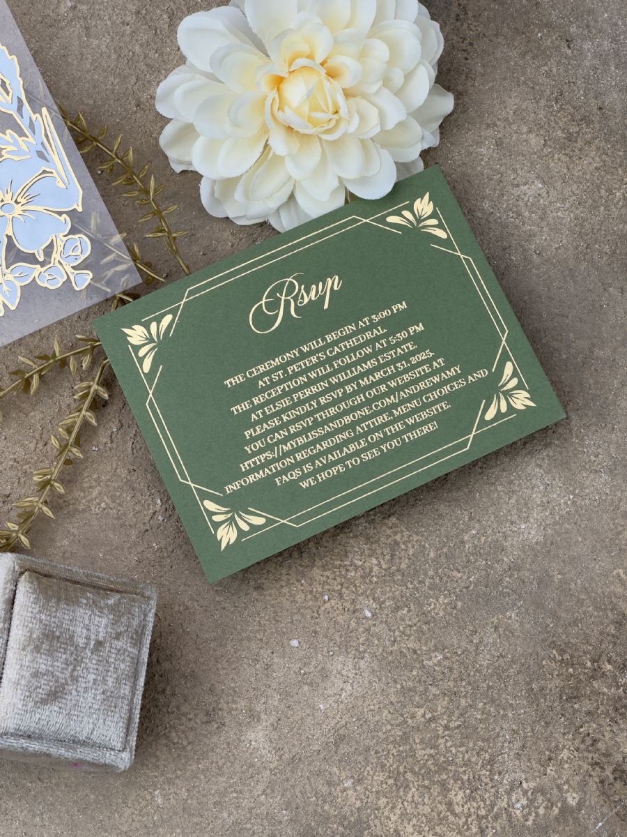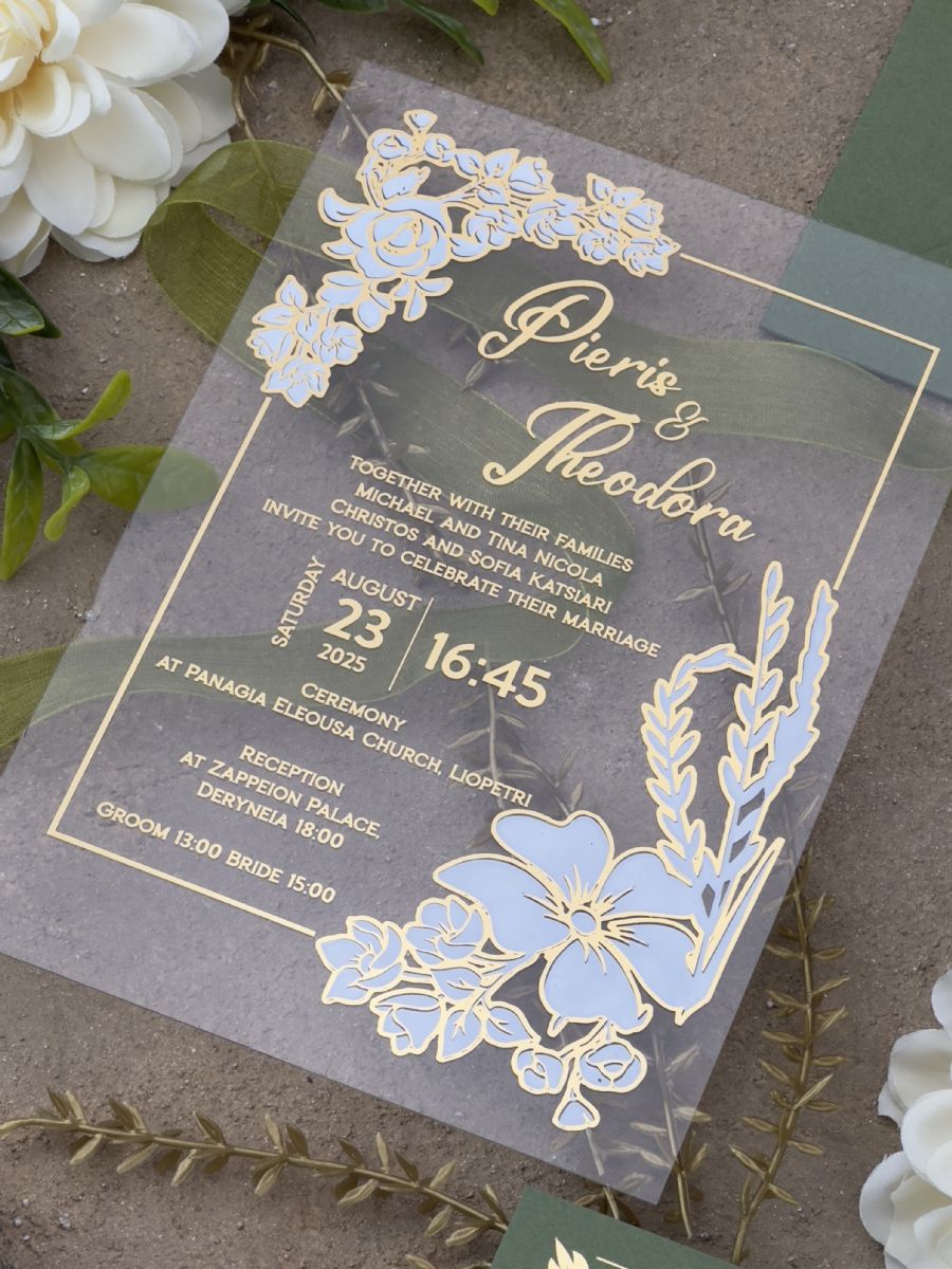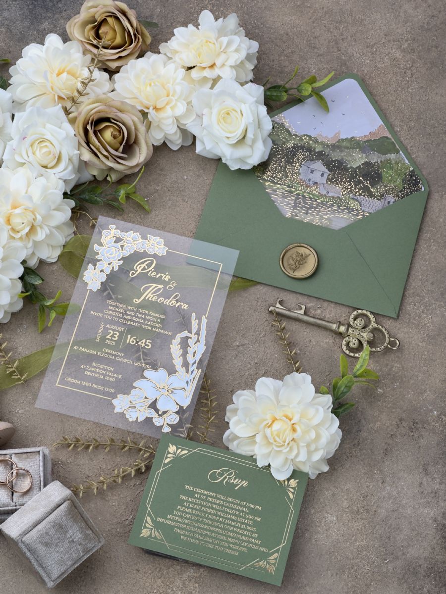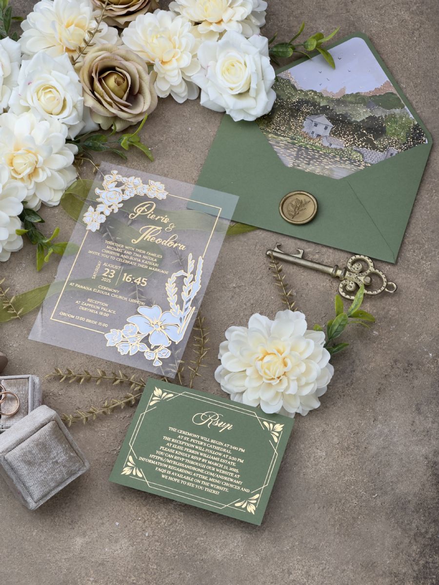 Yeşil Doğa Temalı Sulu Boyalı Çift Yaldız Baskılı Akrilik Davetiye
